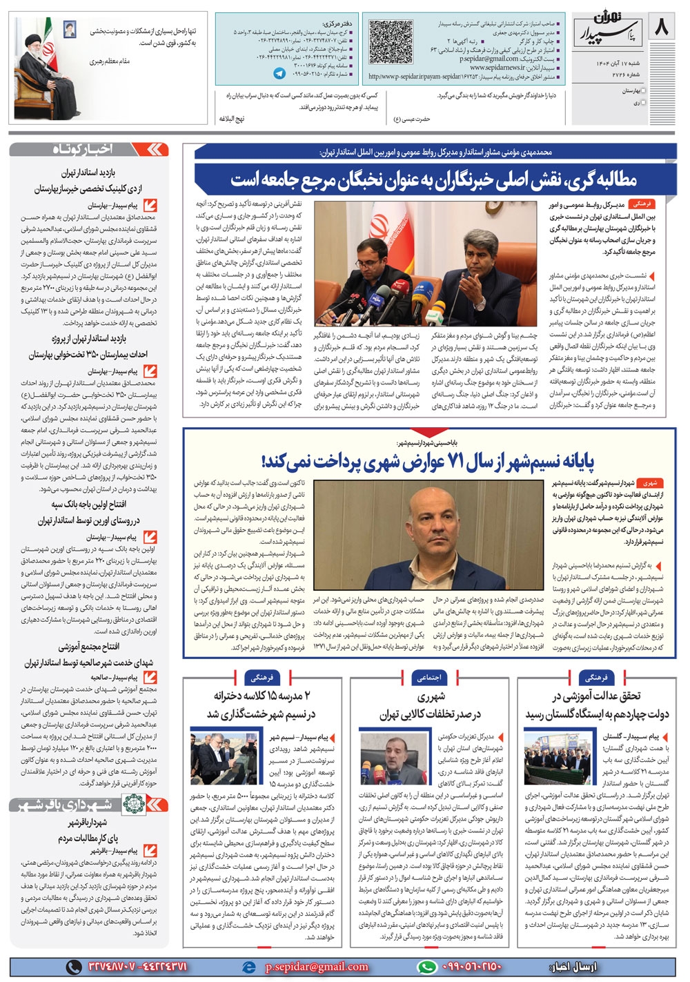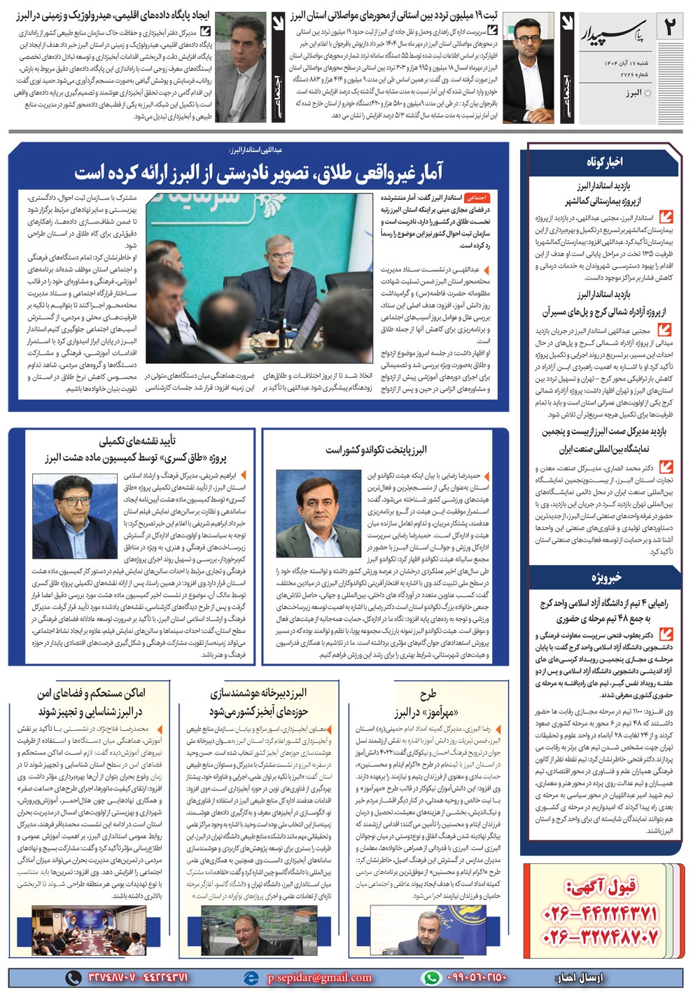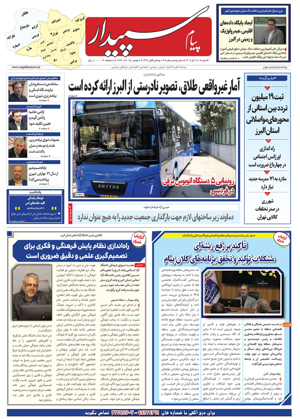 روزنامه پیام سپیدار شماره 2726 شنبه هفدهم آبان سال هزارو چهارصدو چهار منتشر شد و در دسترس مخاطبین قرار گرفت. روزنامه پیام سپیدار را می توانید از کیوسک های مطبوعاتی سطح شهر تهیه کنید.