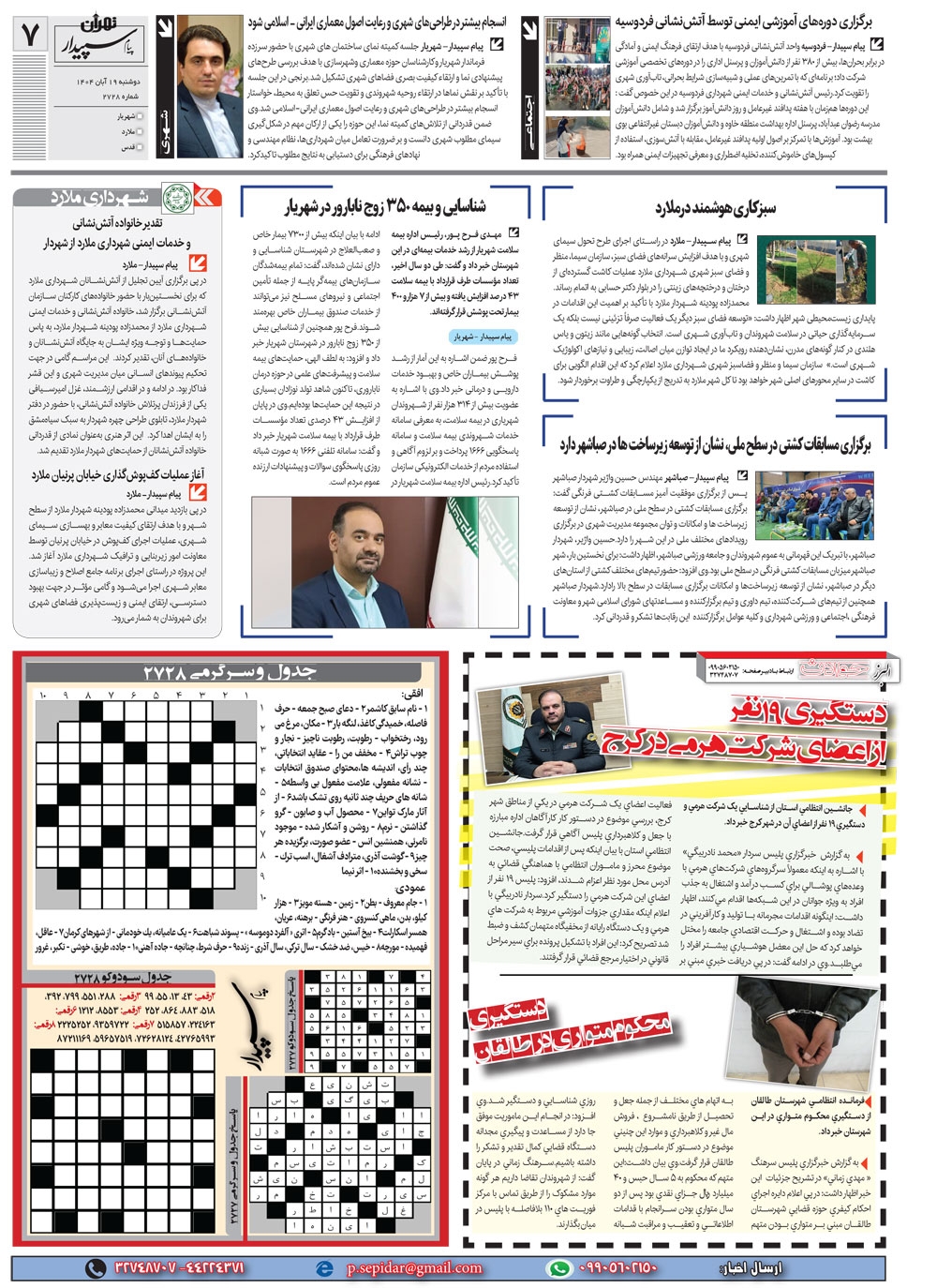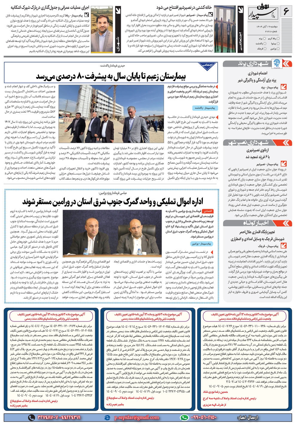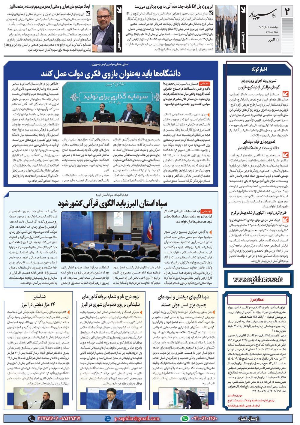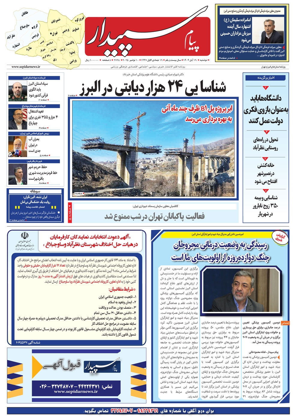 روزنامه پیام سپیدار شماره 2728 دوشنبه نوزدهم آبان سال هزارو چهارصدو چهار منتشر شد و در دسترس مخاطبین قرار گرفت. روزنامه پیام سپیدار را می توانید از کیوسک های مطبوعاتی سطح شهر تهیه کنید.