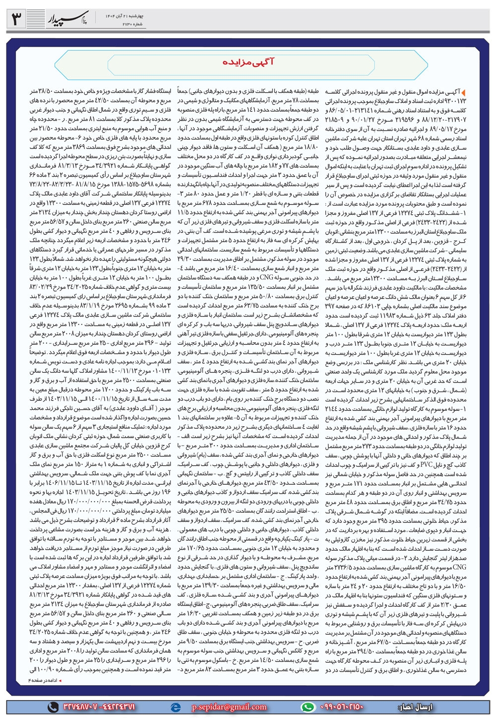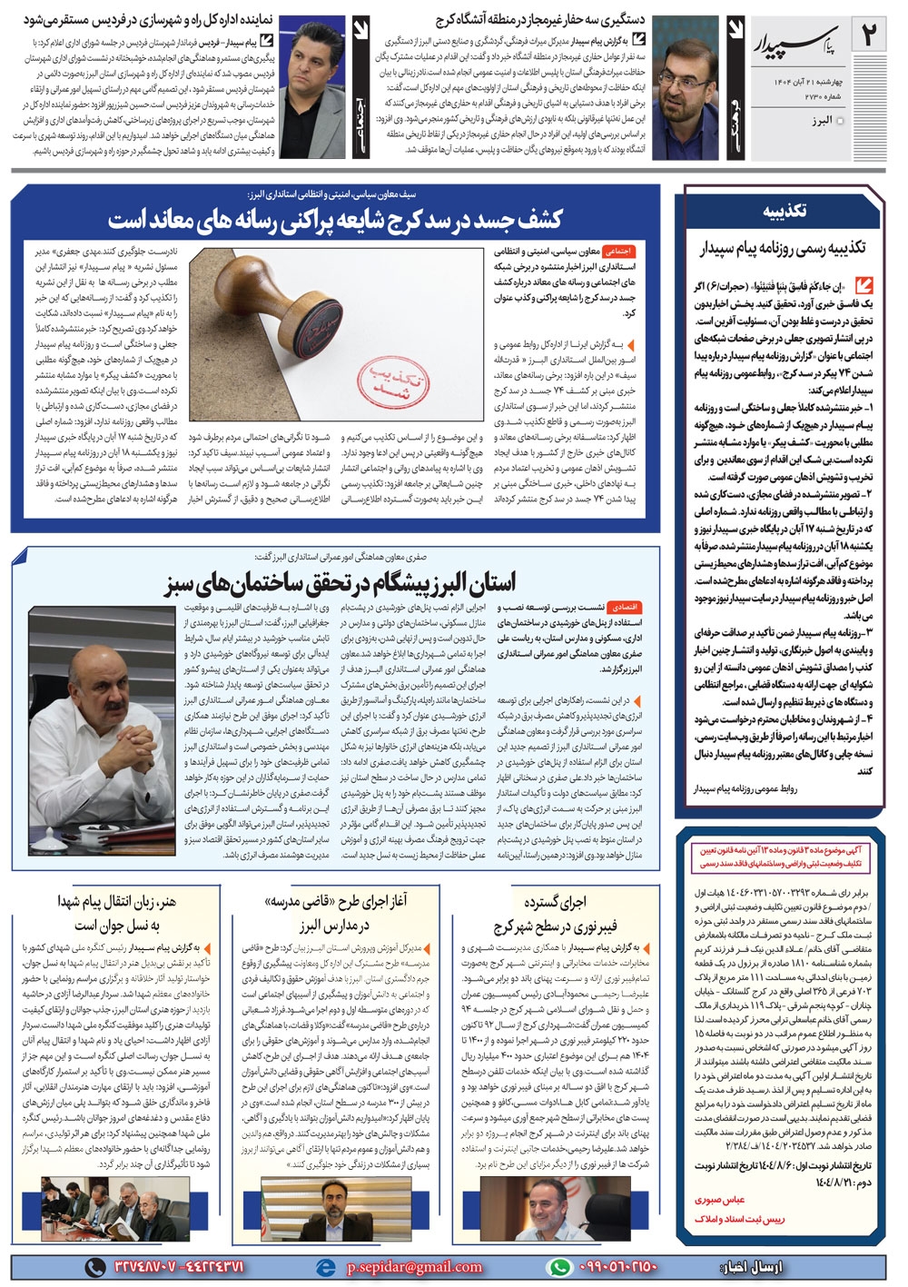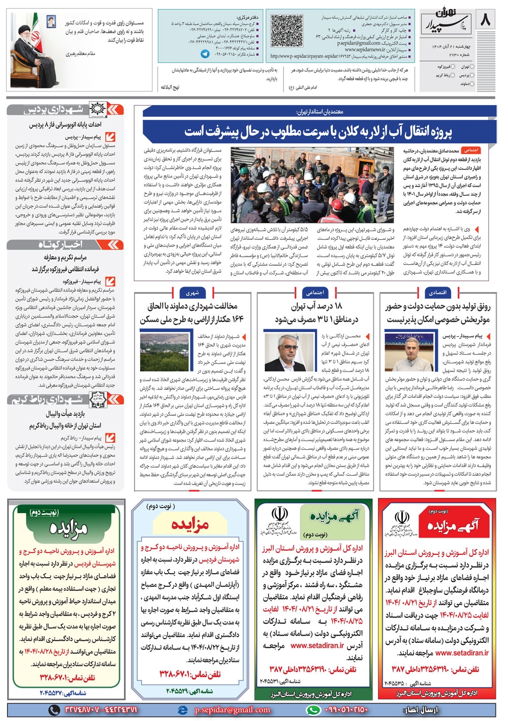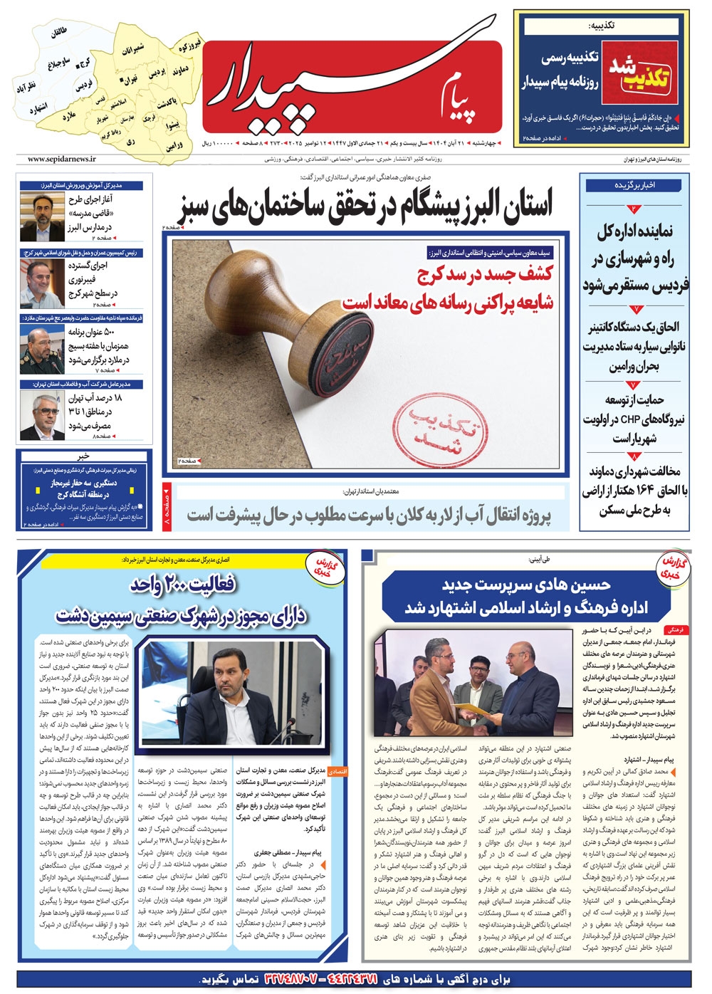 روزنامه پیام سپیدار شماره 2730 چهارشنبه بیست و یکم آبان سال هزارو چهارصدو چهار منتشر شد و در دسترس مخاطبین قرار گرفت. روزنامه پیام سپیدار را می توانید از کیوسک های مطبوعاتی سطح شهر تهیه کنید.