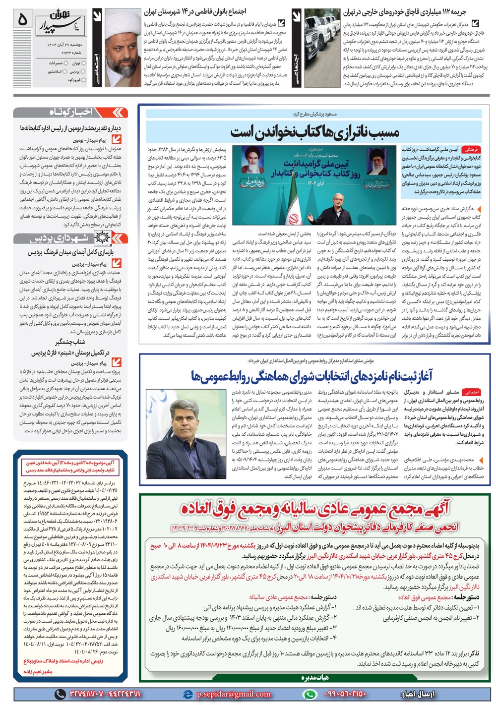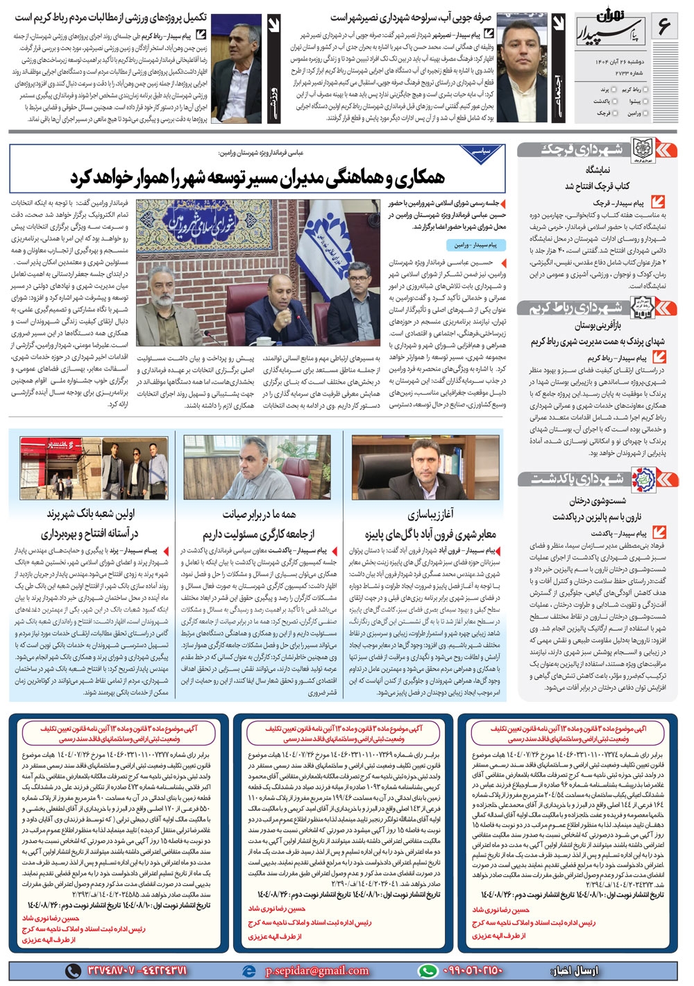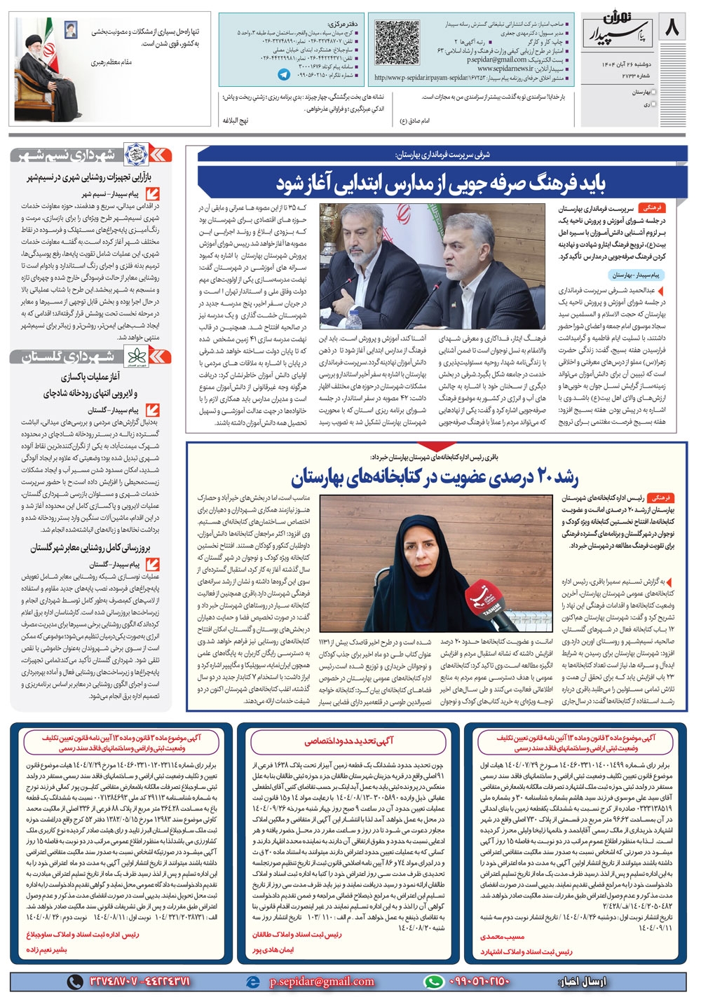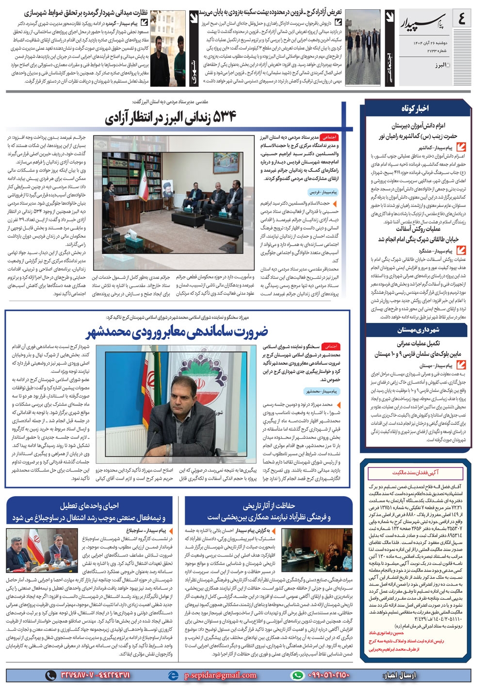 روزنامه پیام سپیدار شماره 2733 دوشنبه بیست و ششم آبان سال هزارو چهارصدو چهار منتشر شد و در دسترس مخاطبین قرار گرفت. روزنامه پیام سپیدار را می توانید از کیوسک های مطبوعاتی سطح شهر تهیه کنید.