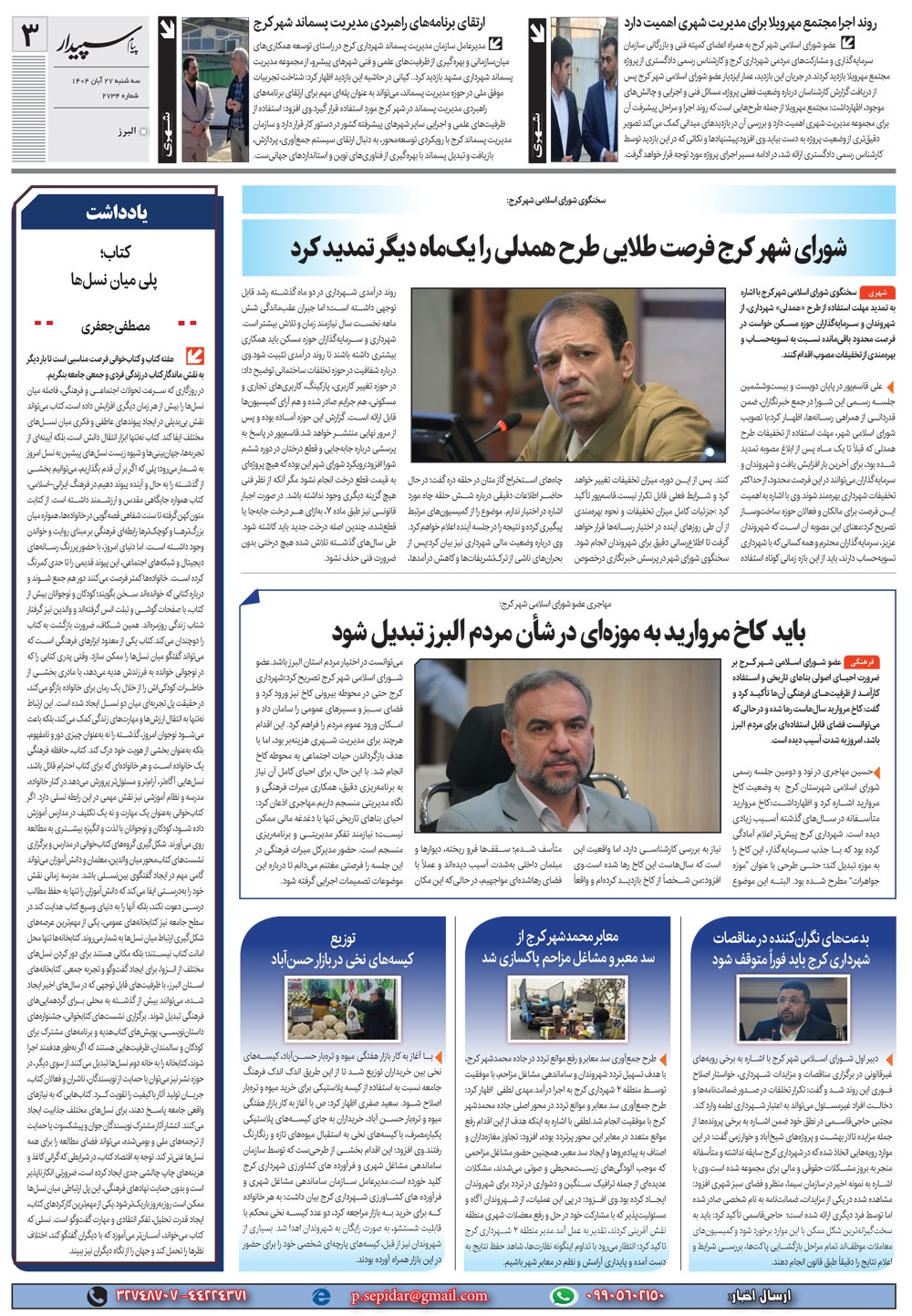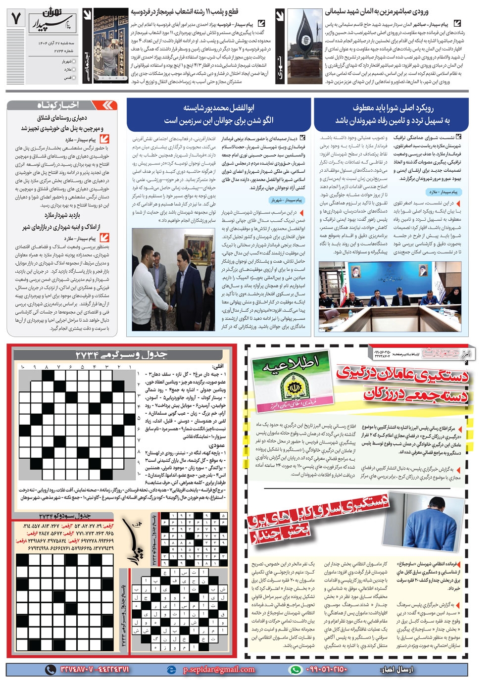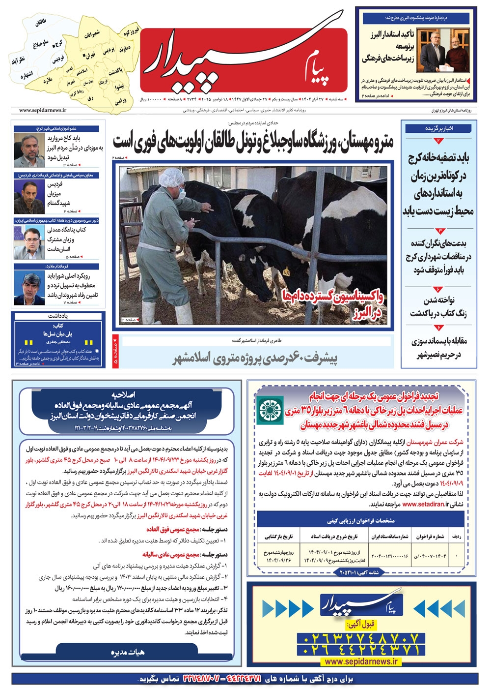روزنامه پیام سپیدار شماره 2734 سه شنبه بیست و هفتم آبان سال هزارو چهارصدو چهار منتشر شد و در دسترس مخاطبین قرار گرفت. روزنامه پیام سپیدار را می توانید از کیوسک های مطبوعاتی سطح شهر تهیه کنید.