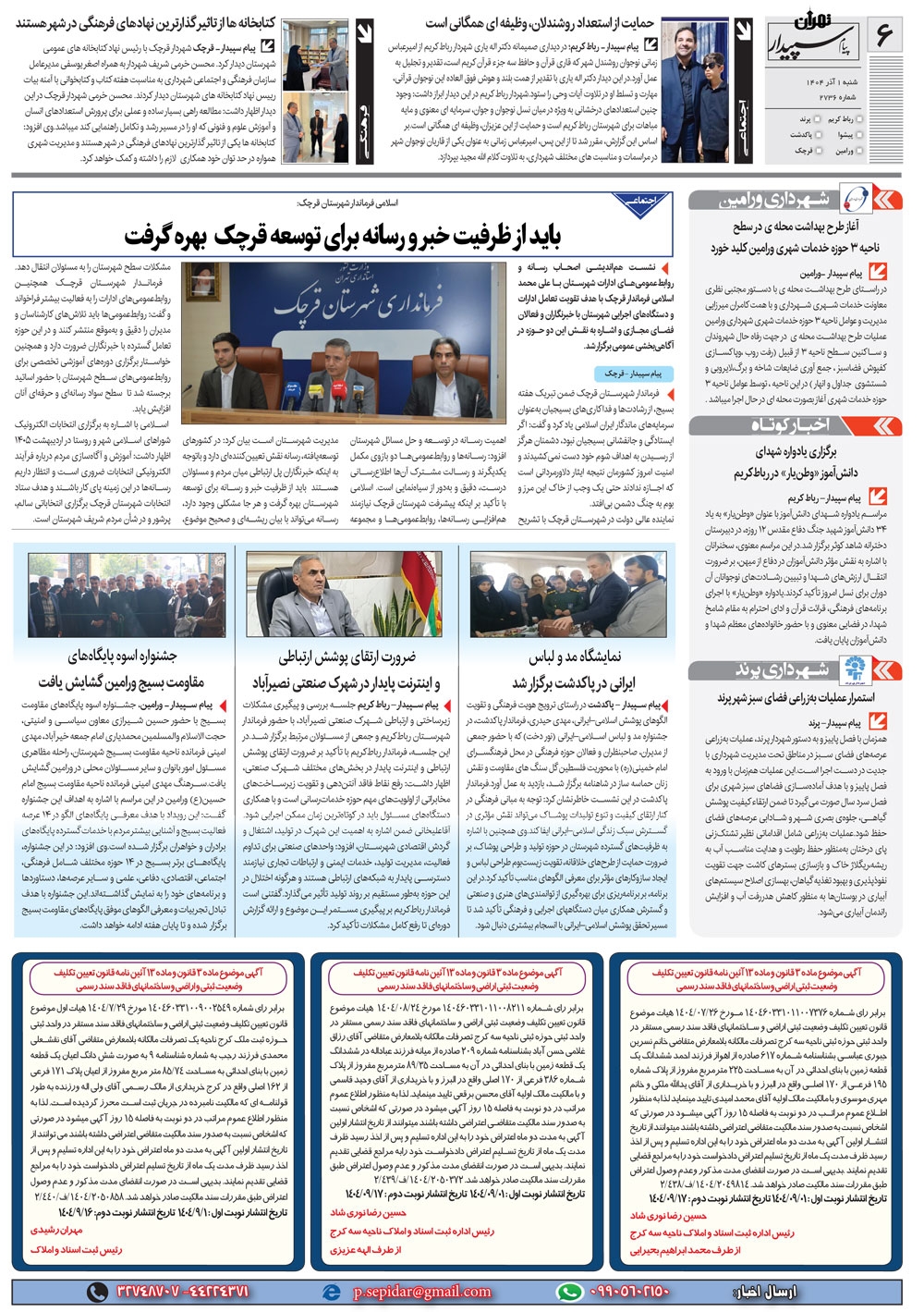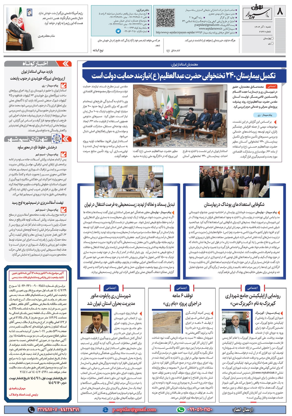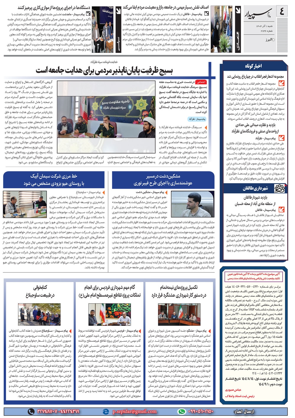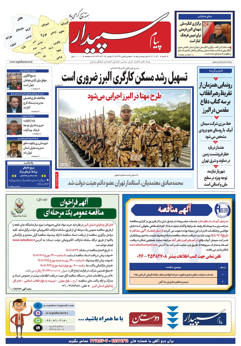 روزنامه پیام سپیدار شماره 2736 شنبه یکم آذر سال هزارو چهارصدو چهار منتشر شد و در دسترس مخاطبین قرار گرفت. روزنامه پیام سپیدار را می توانید از کیوسک های مطبوعاتی سطح شهر تهیه کنید.