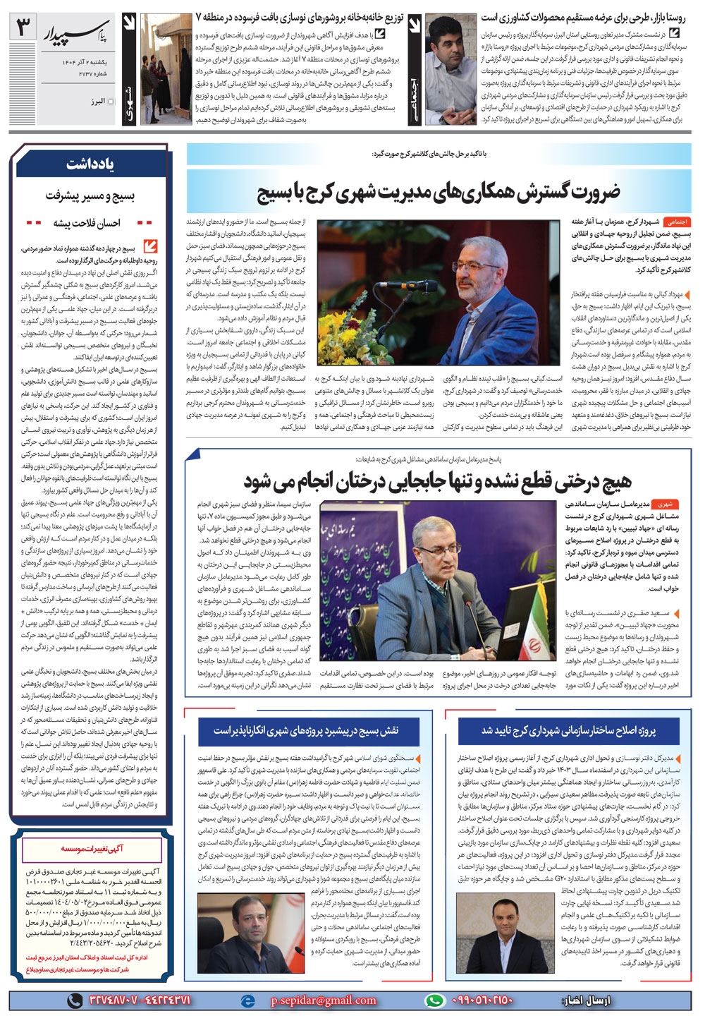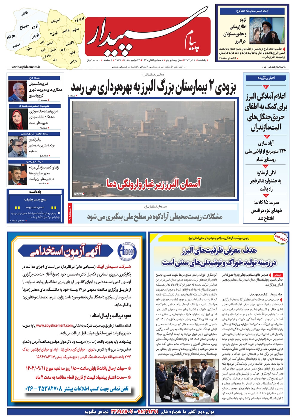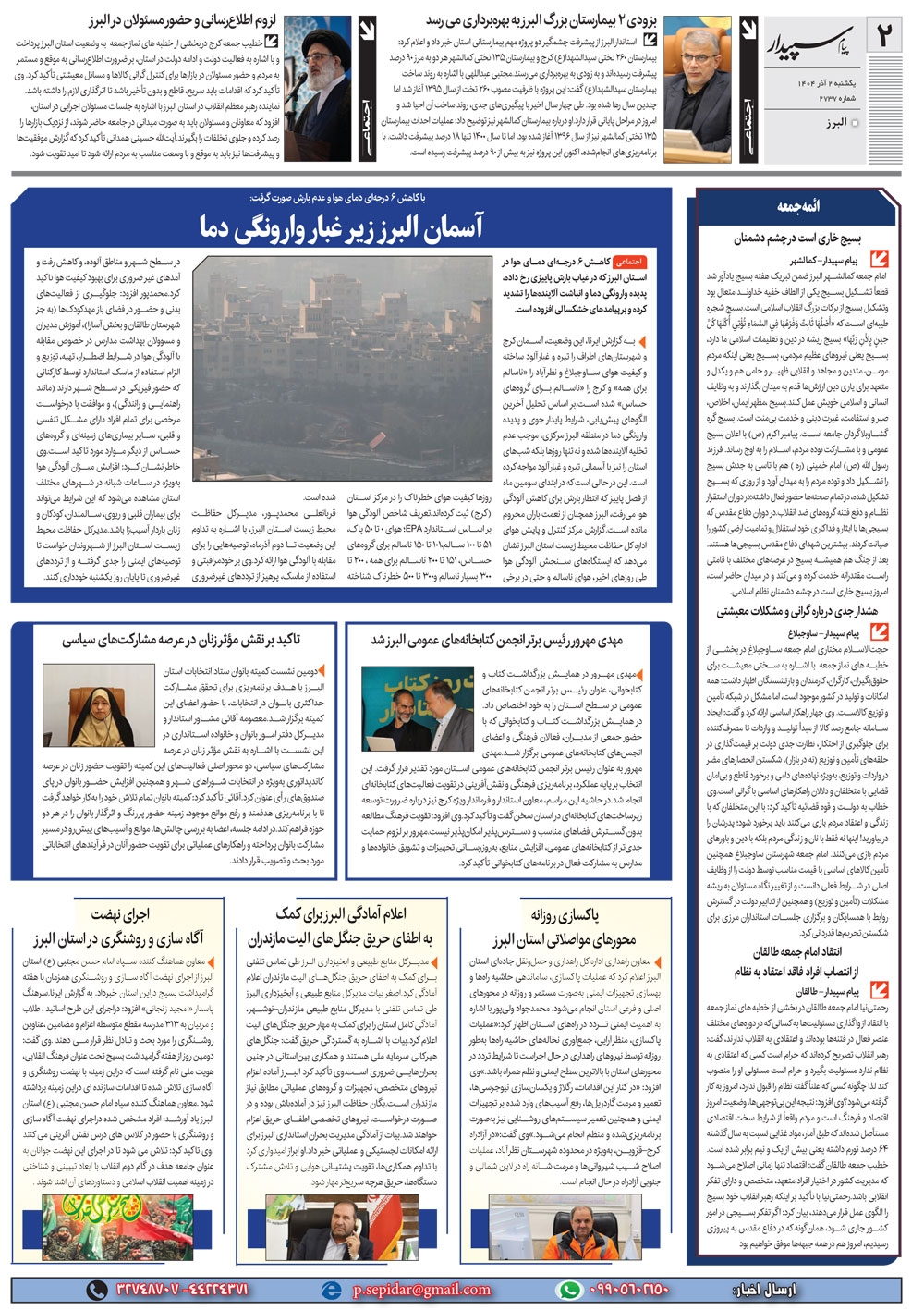 روزنامه پیام سپیدار شماره 2737 یکشنبه دوم آذر سال هزارو چهارصدو چهار منتشر شد و در دسترس مخاطبین قرار گرفت. روزنامه پیام سپیدار را می توانید از کیوسک های مطبوعاتی سطح شهر تهیه کنید.