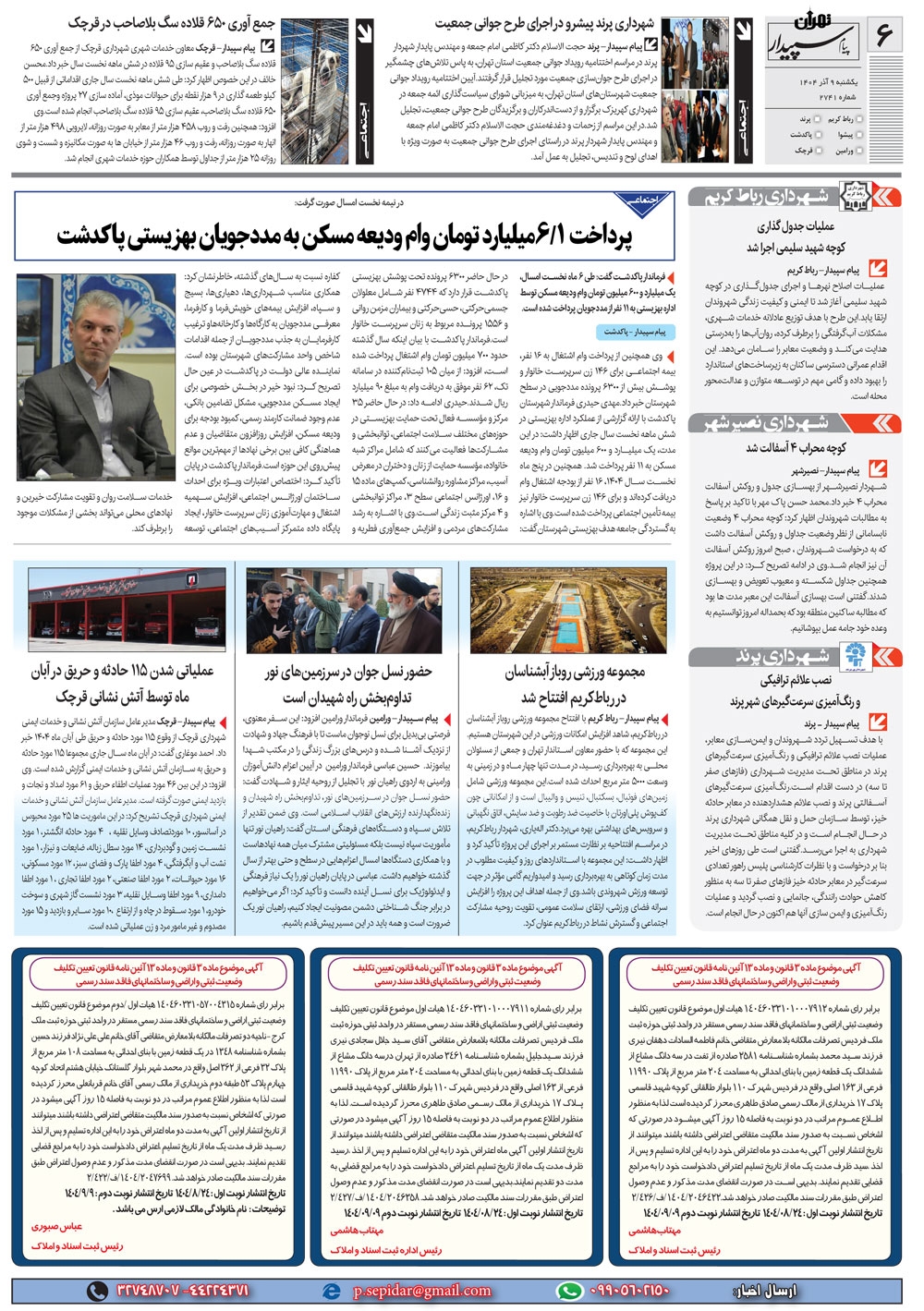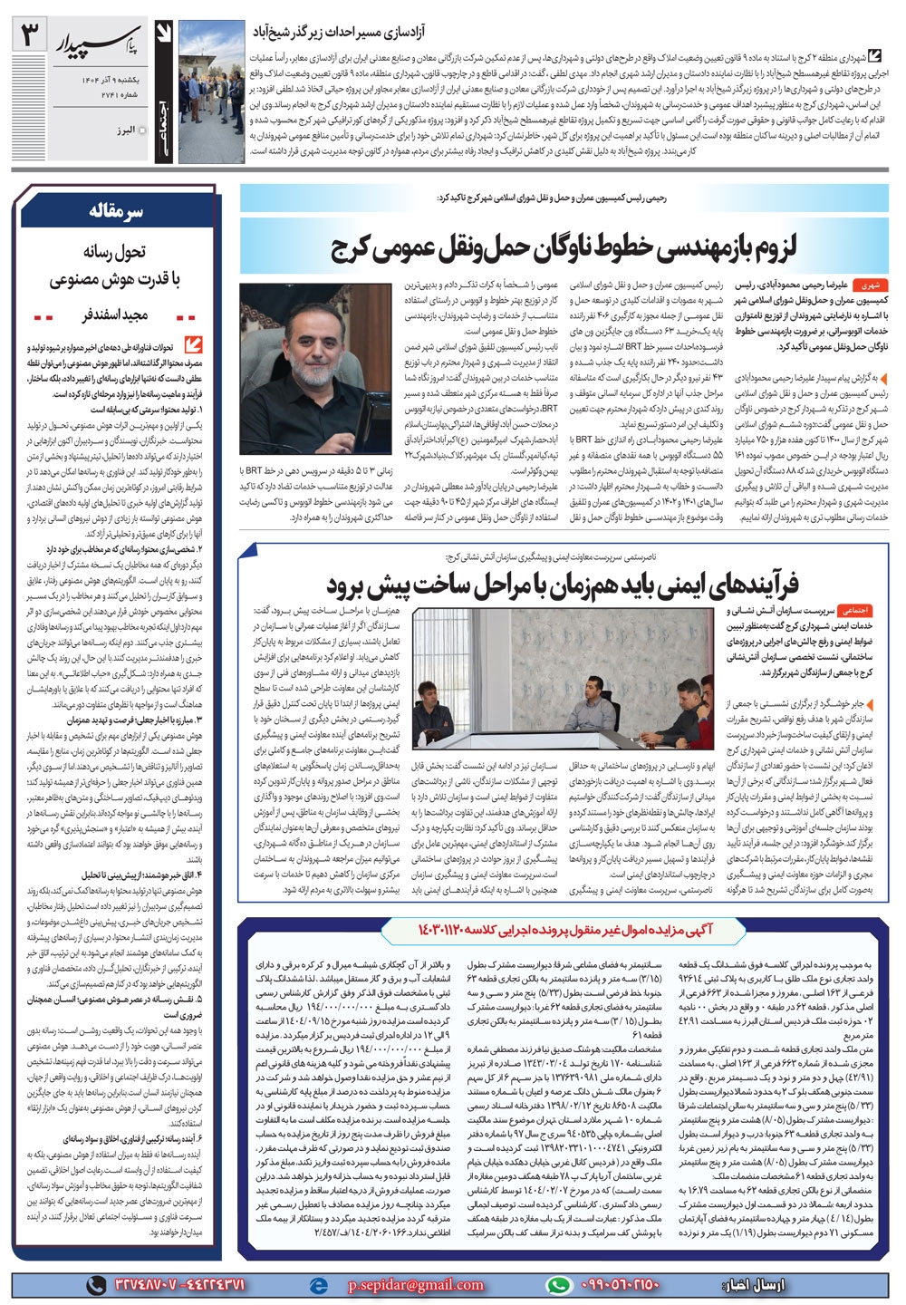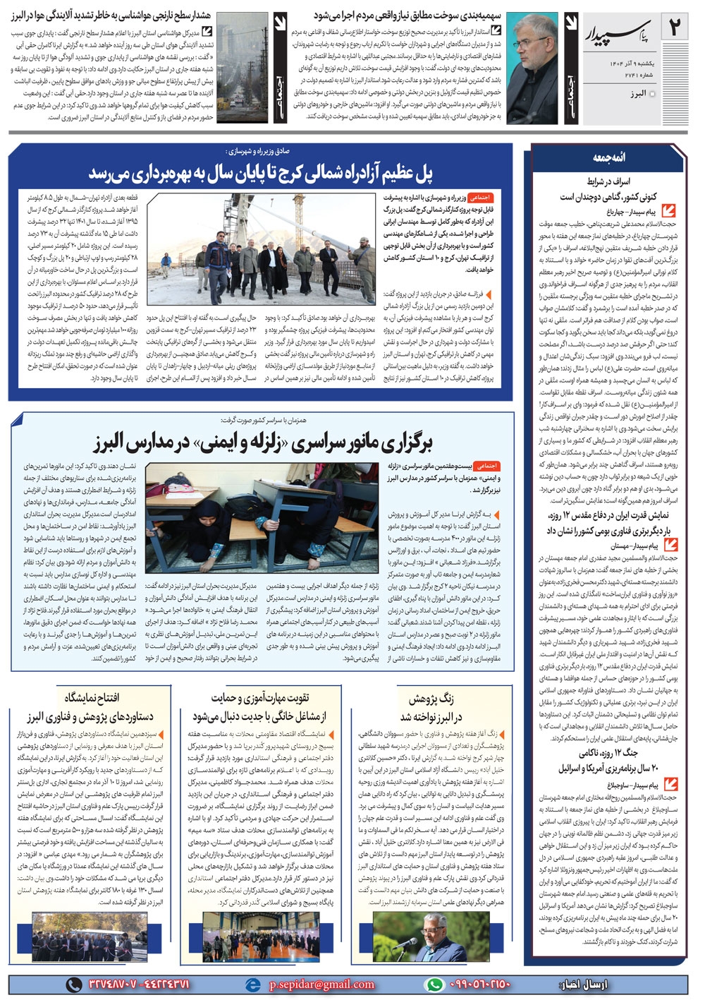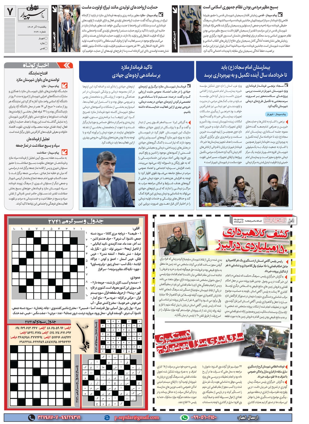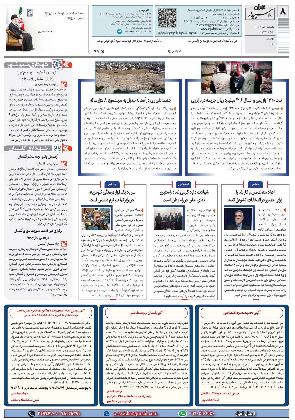 روزنامه پیام سپیدار شماره 2741 یکشنبه نهم آذر سال هزارو چهارصدو چهار منتشر شد و در دسترس مخاطبین قرار گرفت. روزنامه پیام سپیدار را می توانید از کیوسک های مطبوعاتی سطح شهر تهیه کنید.