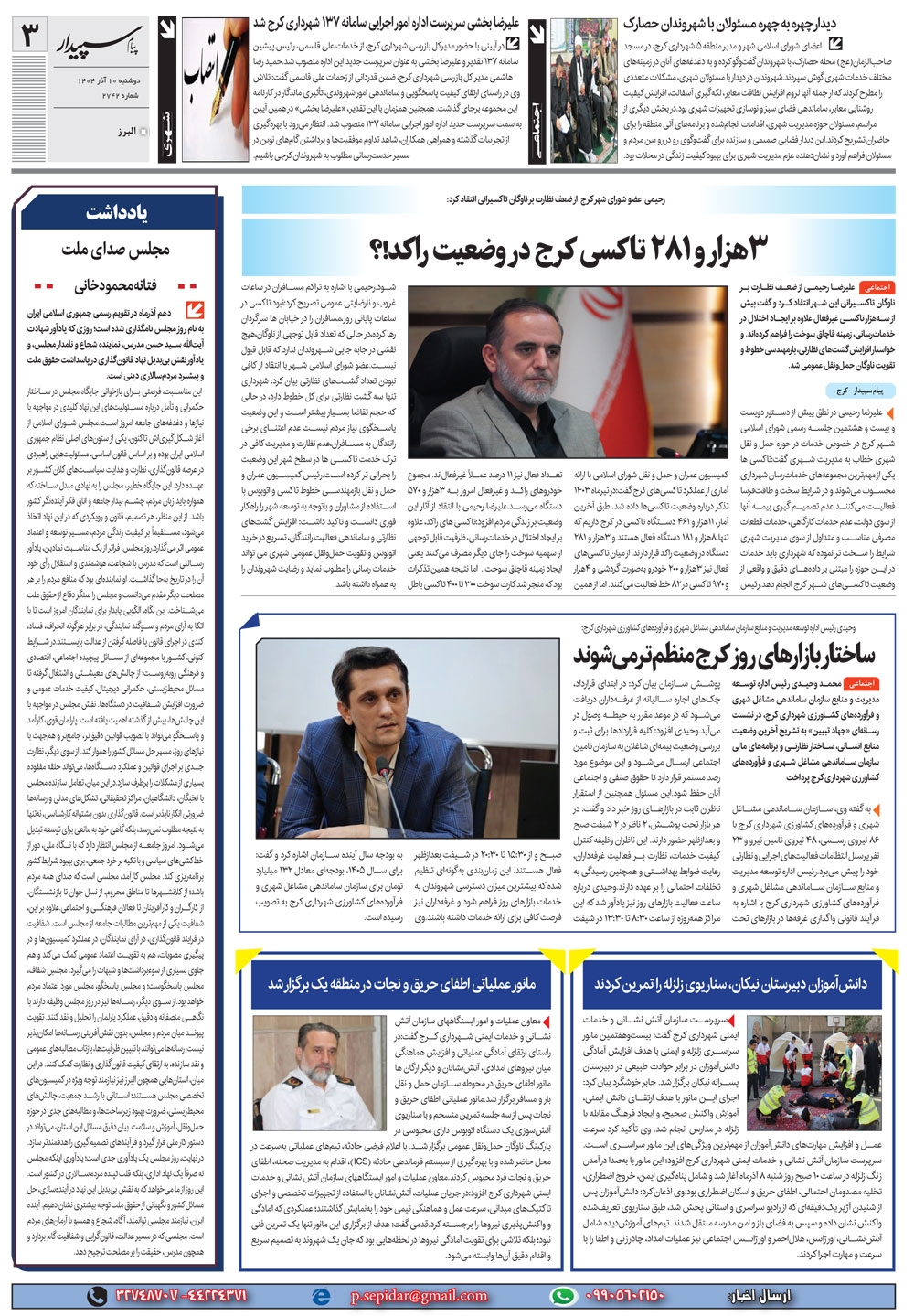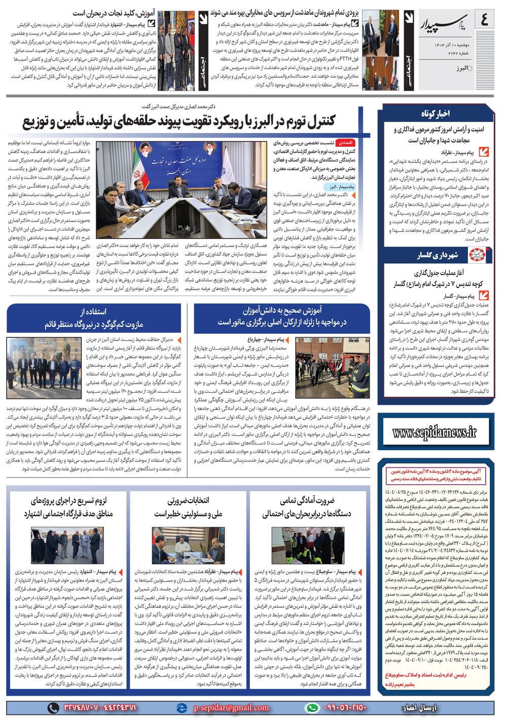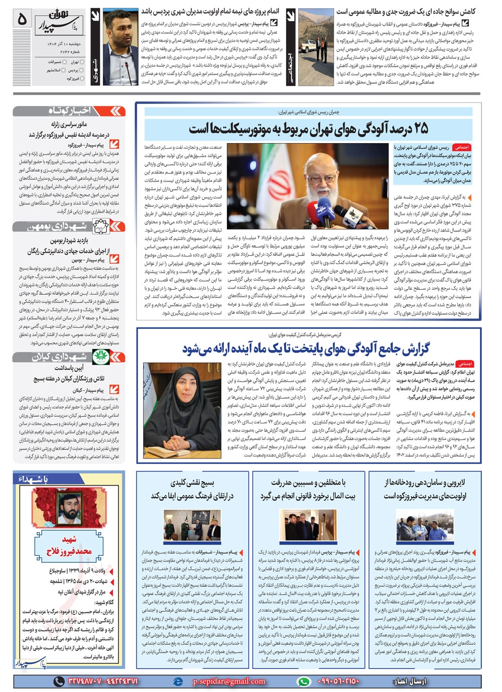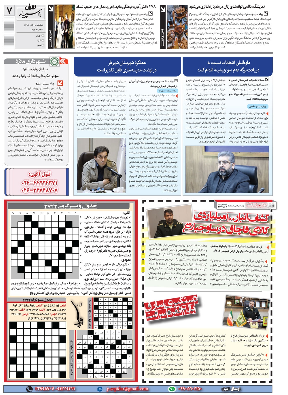 روزنامه پیام سپیدار شماره 2742 دوشنبه دهم آذر سال هزارو چهارصدو چهار منتشر شد و در دسترس مخاطبین قرار گرفت. روزنامه پیام سپیدار را می توانید از کیوسک های مطبوعاتی سطح شهر تهیه کنید.