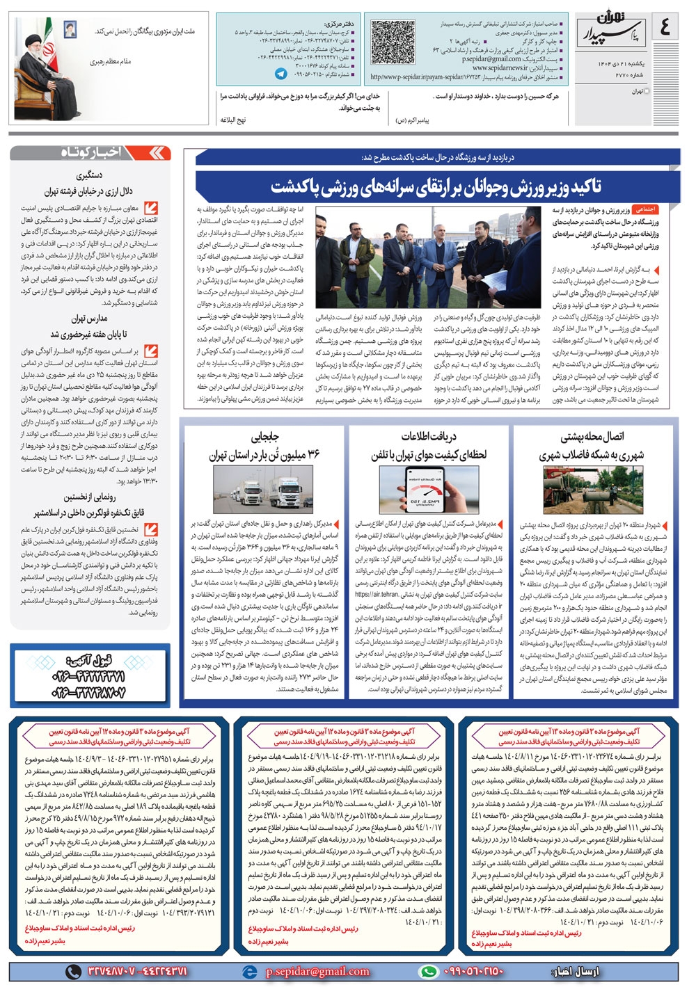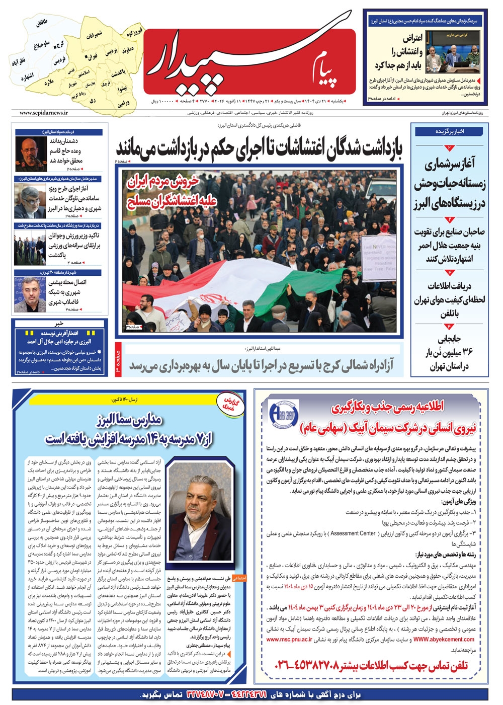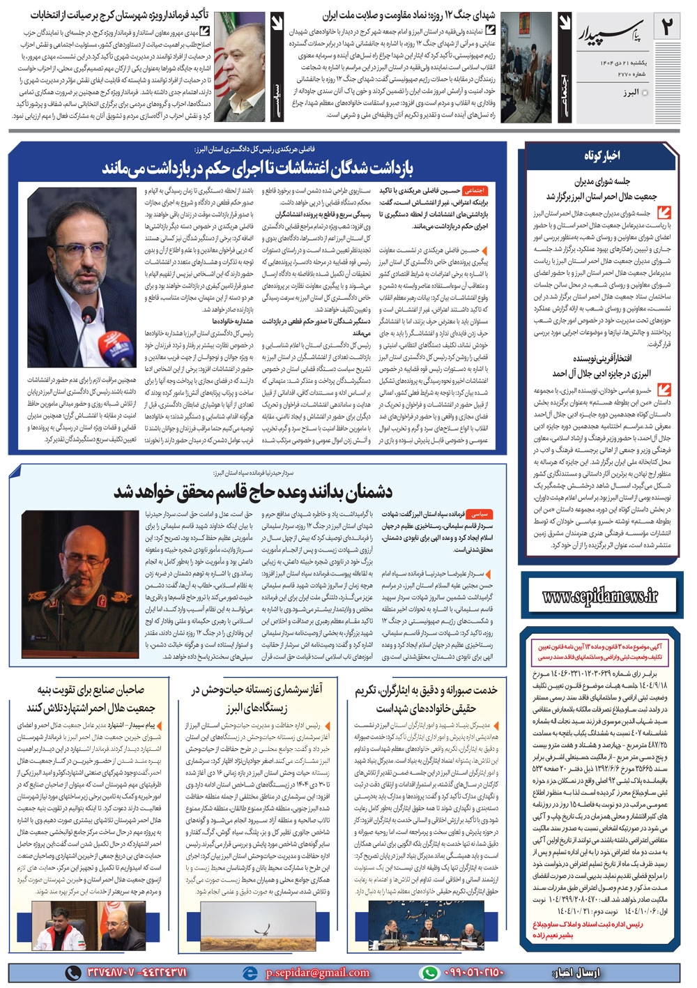 روزنامه پیام سپیدار شماره 2770 یکشنبه بیست و یکم دیماه سال هزارو چهارصدو چهار منتشر شد و در دسترس مخاطبین قرار گرفت. روزنامه پیام سپیدار را می توانید از کیوسک های مطبوعاتی سطح شهر تهیه کنید.