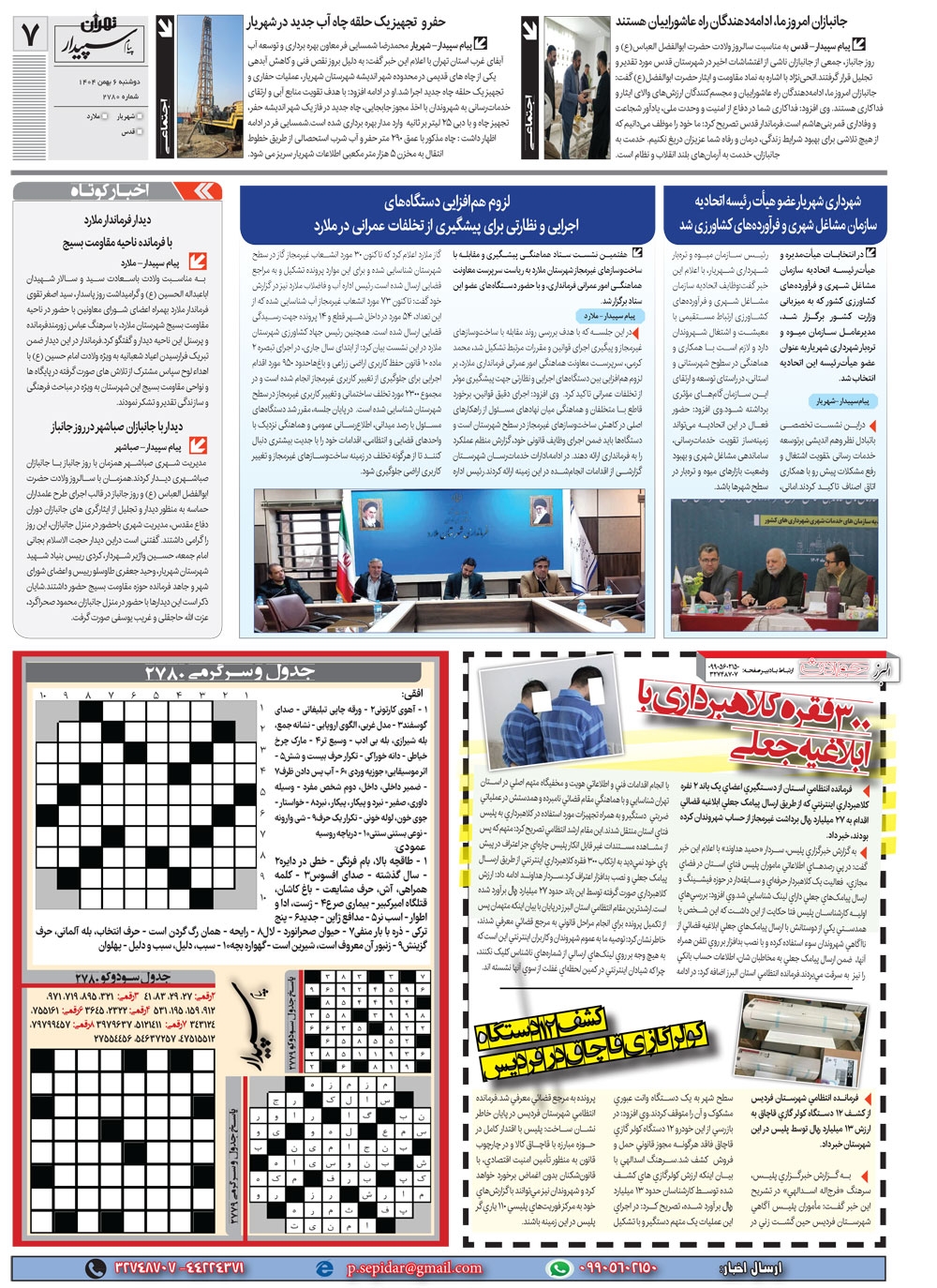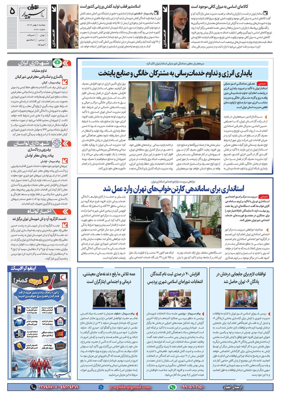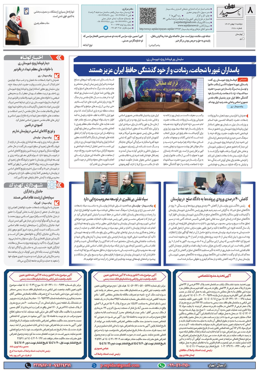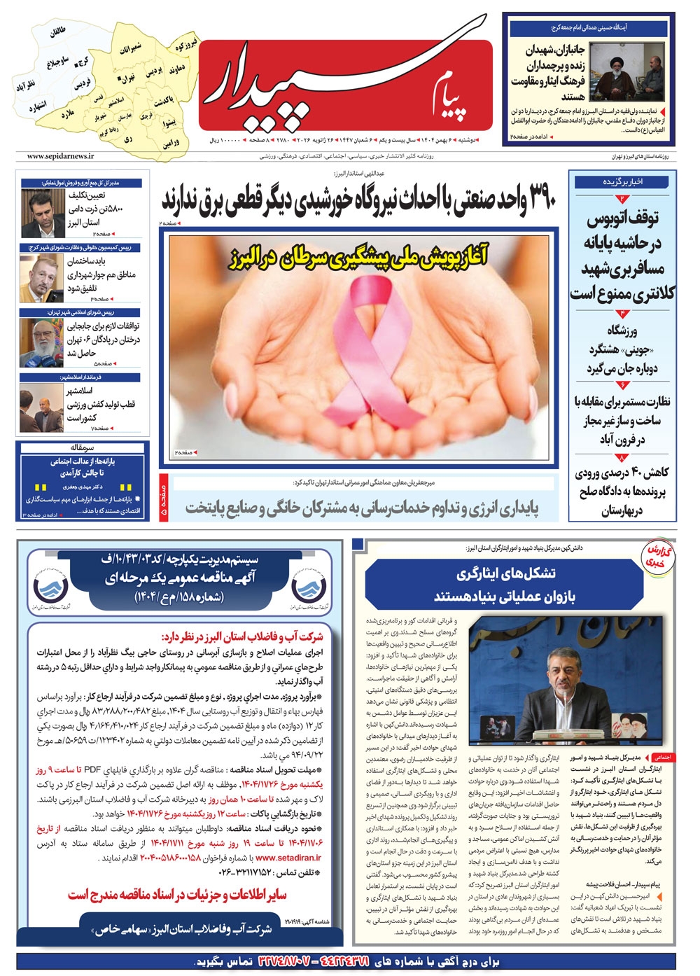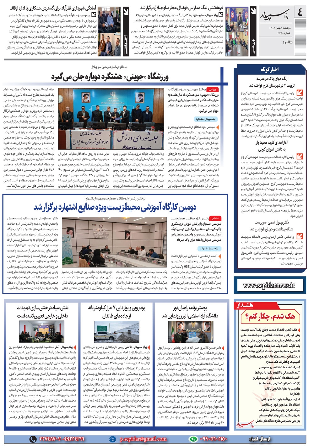 روزنامه پیام سپیدار شماره 2780 دوشنبه ششم دیماه سال هزارو چهارصدو چهار منتشر شد و در دسترس مخاطبین قرار گرفت. روزنامه پیام سپیدار را می توانید از کیوسک های مطبوعاتی سطح شهر تهیه کنید.