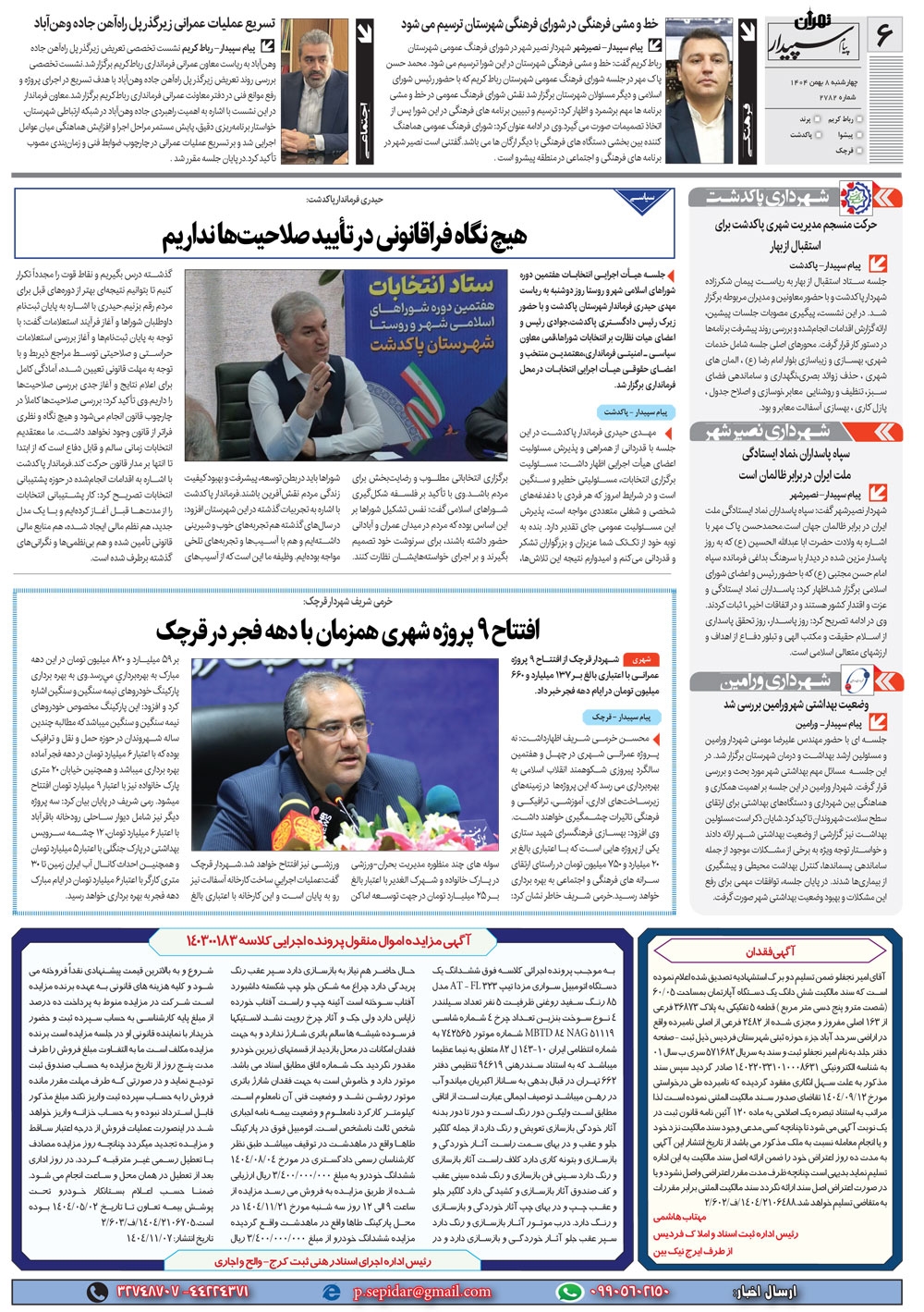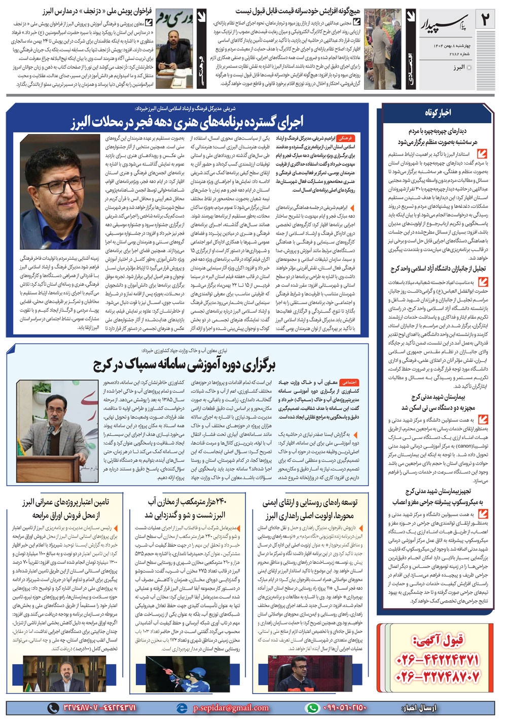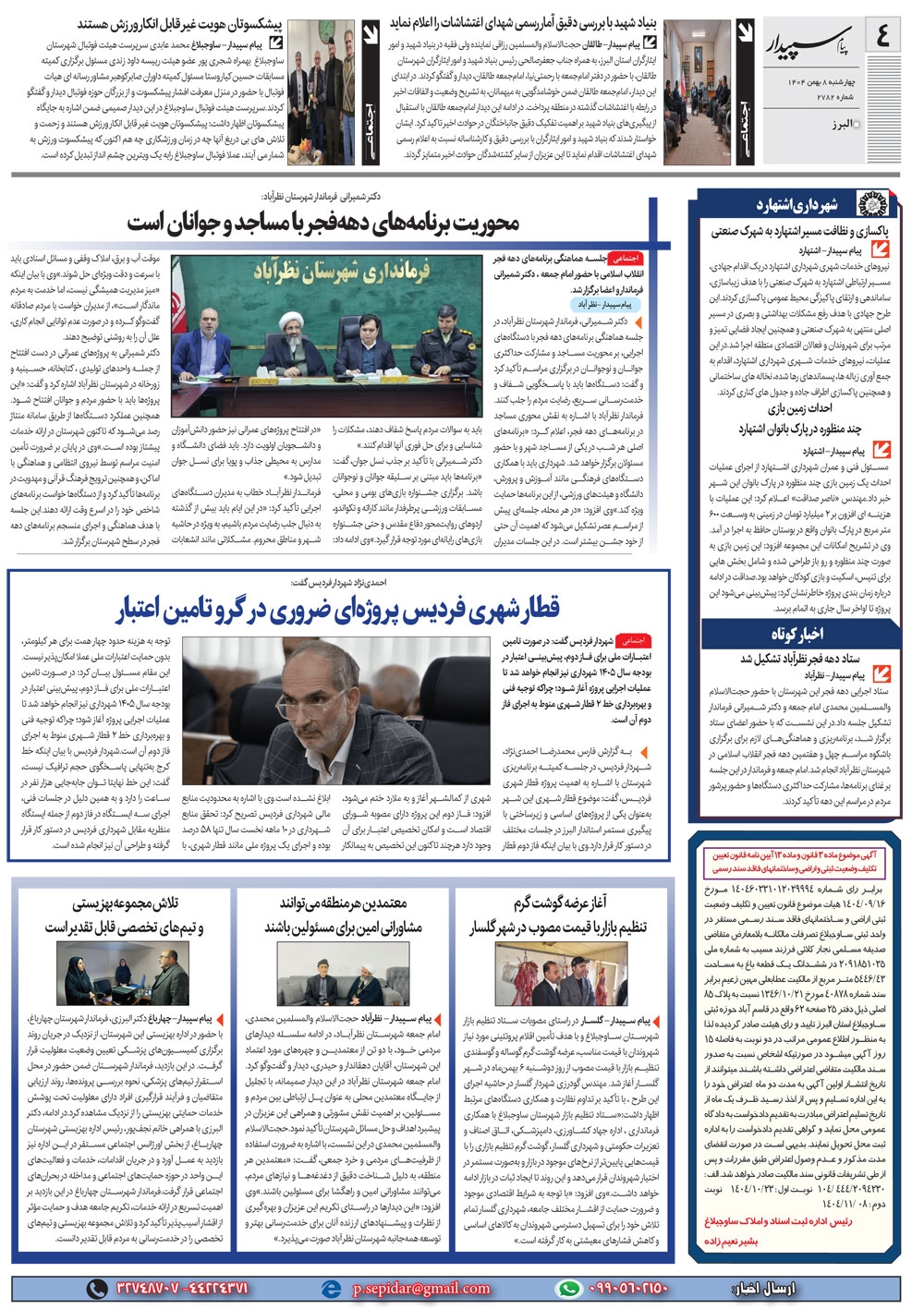روزنامه پیام سپیدار شماره 2782 چهارشنبه هشتم دیماه سال هزارو چهارصدو چهار منتشر شد و در دسترس مخاطبین قرار گرفت. روزنامه پیام سپیدار را می توانید از کیوسک های مطبوعاتی سطح شهر تهیه کنید.