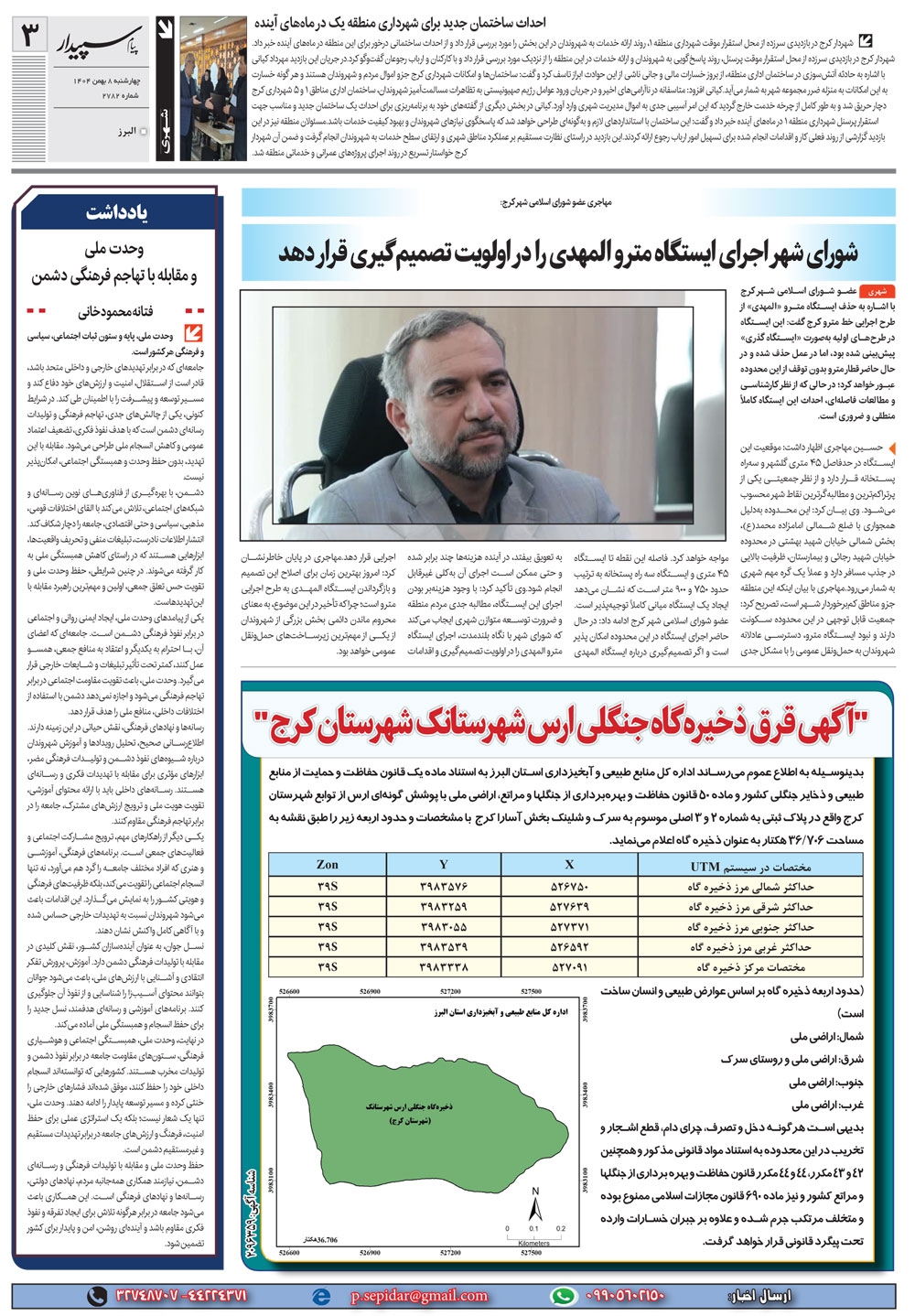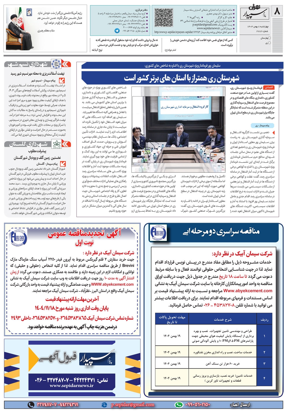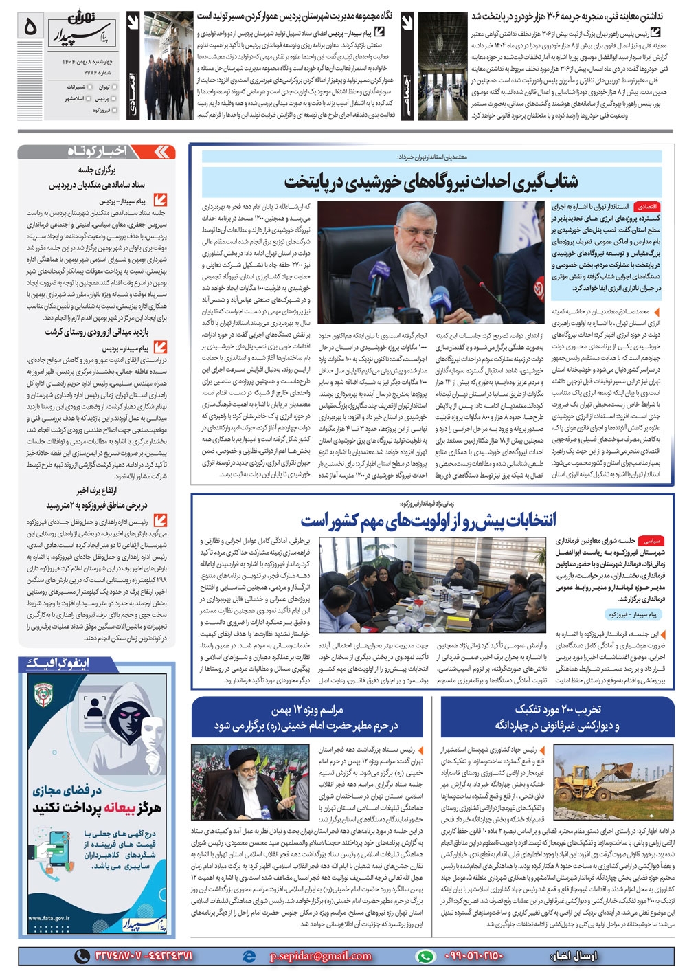 روزنامه پیام سپیدار شماره 2782 چهارشنبه هشتم دیماه سال هزارو چهارصدو چهار منتشر شد و در دسترس مخاطبین قرار گرفت. روزنامه پیام سپیدار را می توانید از کیوسک های مطبوعاتی سطح شهر تهیه کنید.