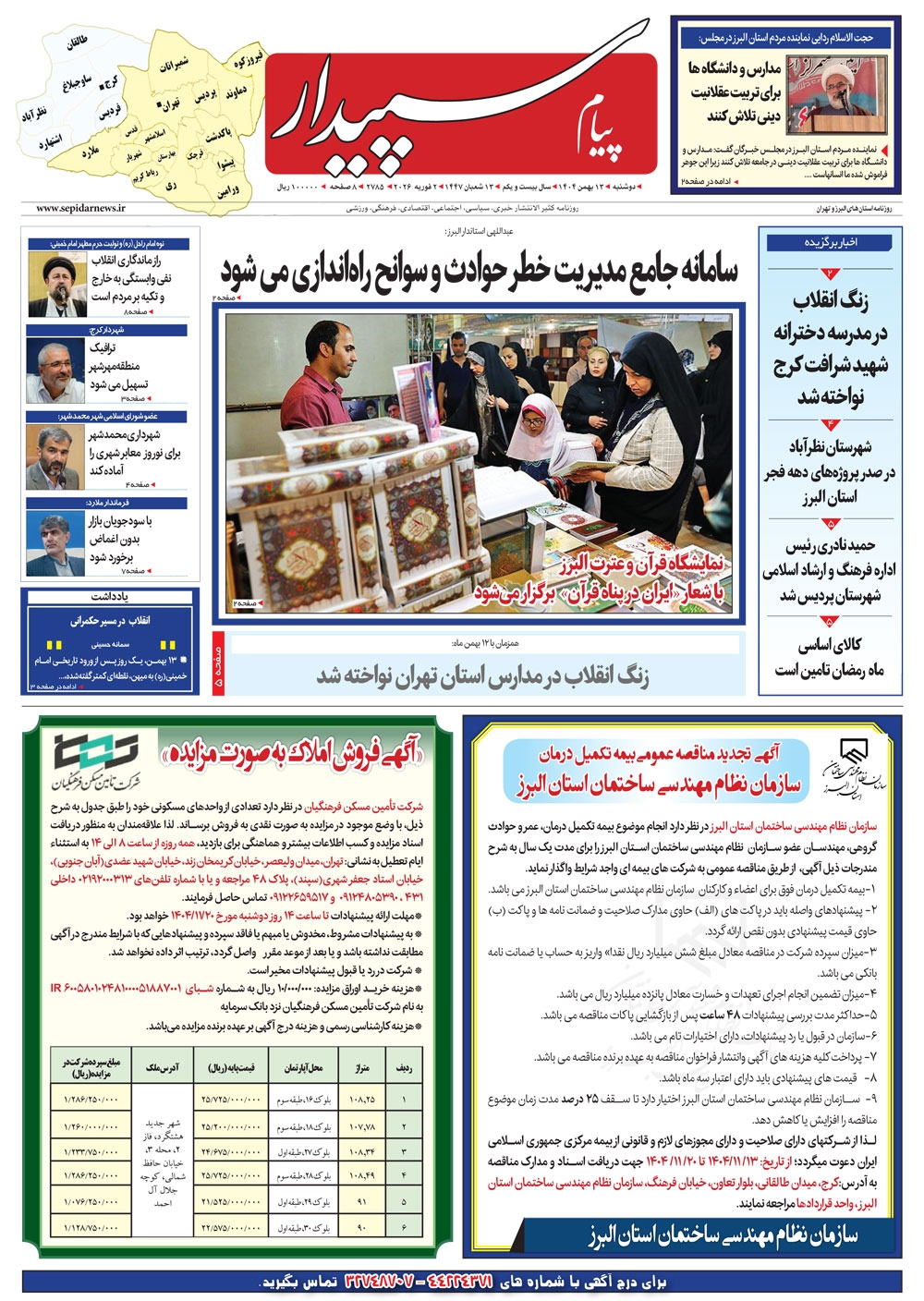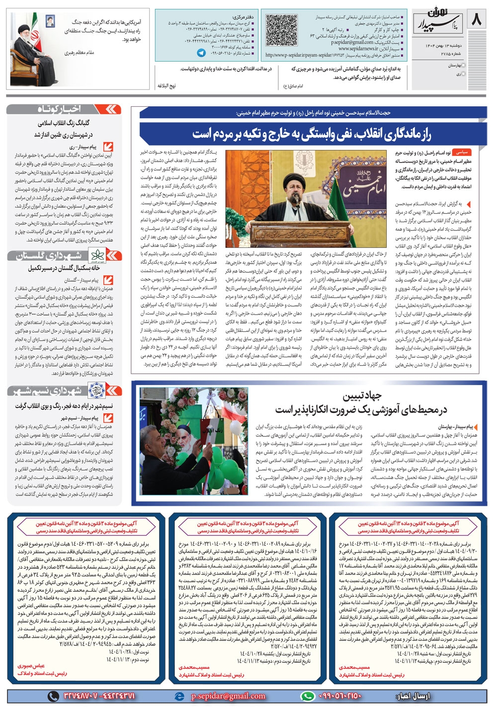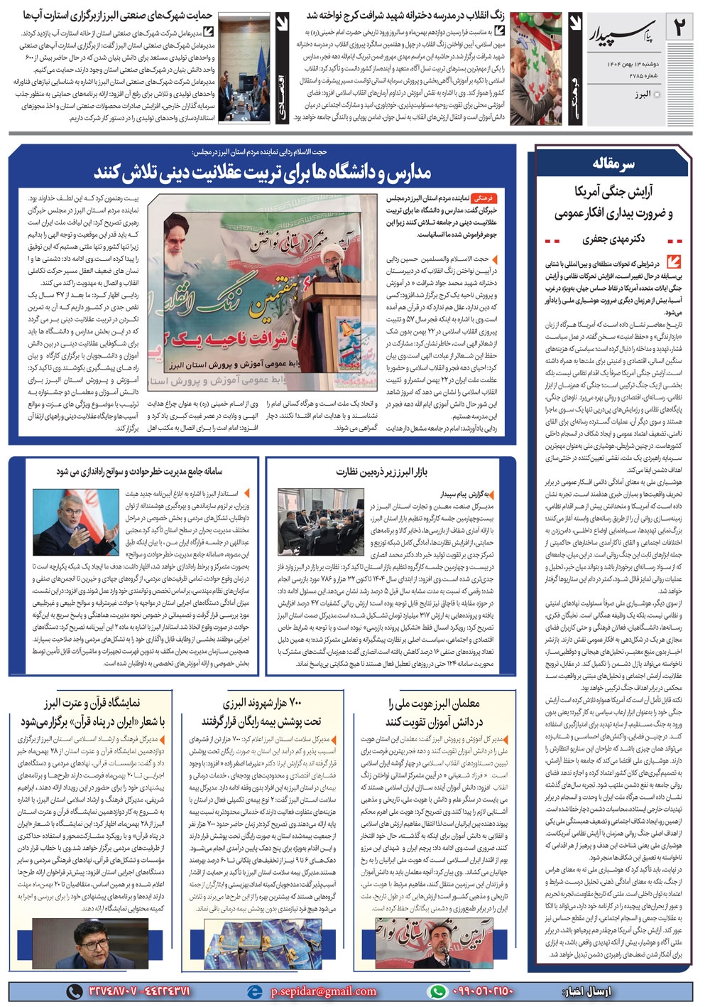 روزنامه پیام سپیدار شماره 2785 دوشنبه سیزدهم بهمن ماه سال هزارو چهارصدو چهار منتشر شد و در دسترس مخاطبین قرار گرفت. روزنامه پیام سپیدار را می توانید از کیوسک های مطبوعاتی سطح شهر تهیه کنید.