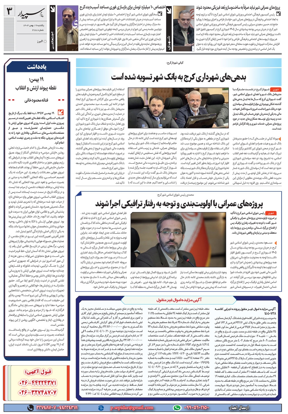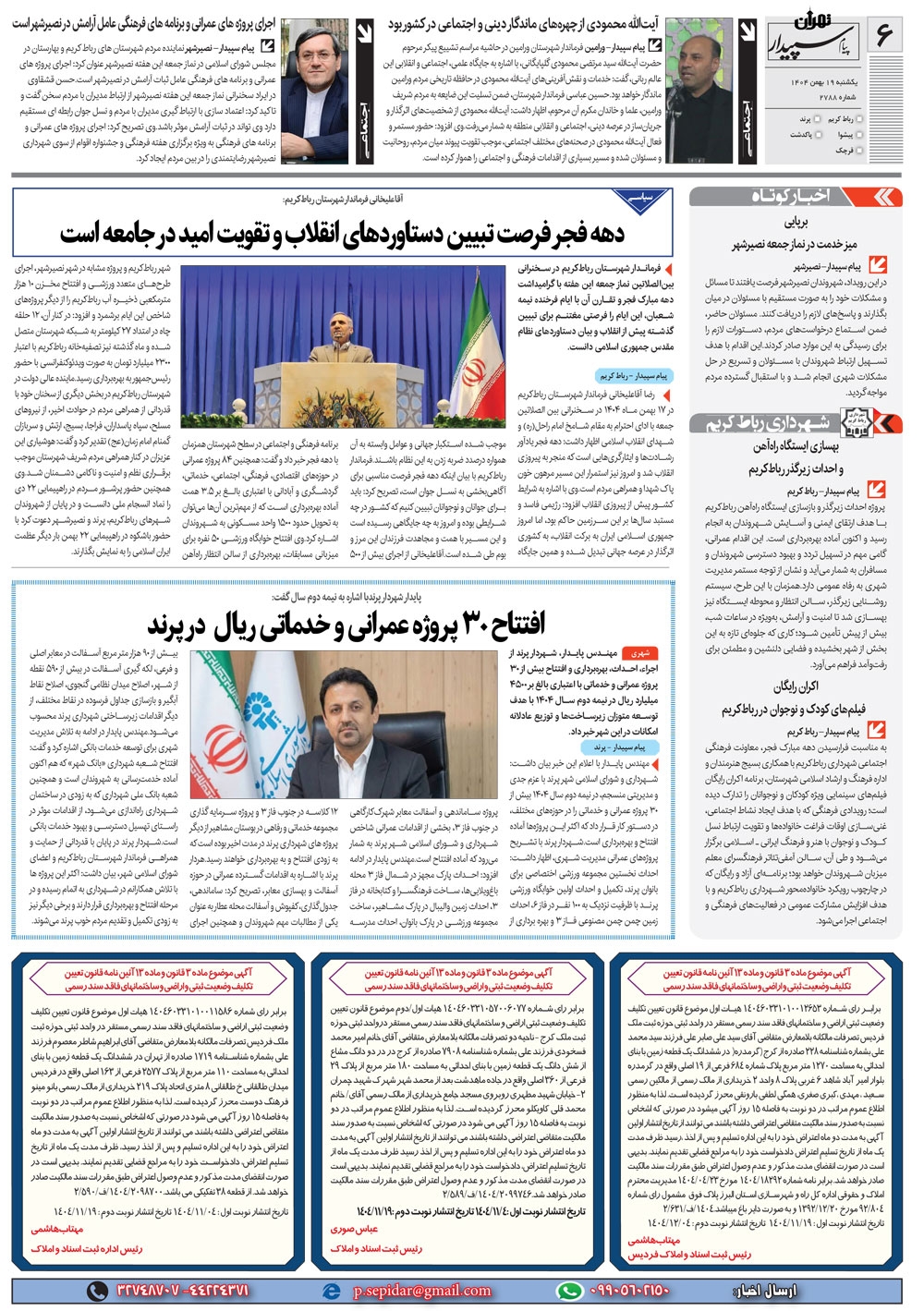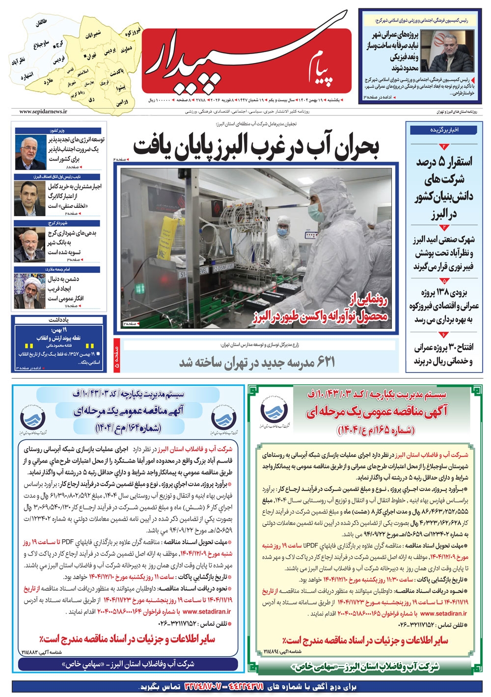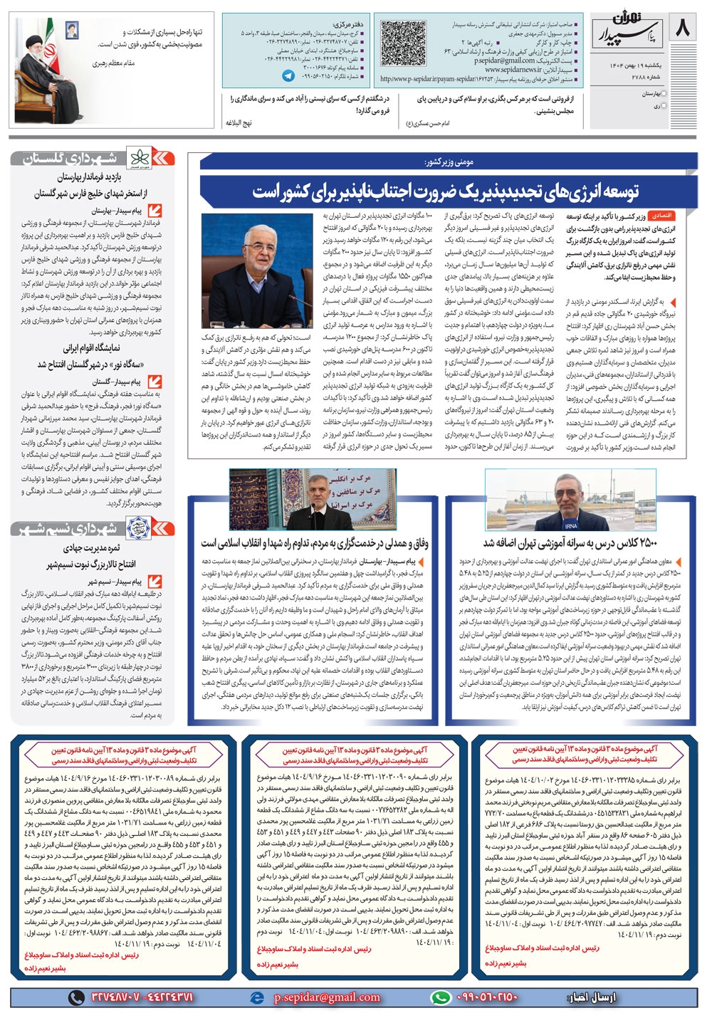 روزنامه پیام سپیدار شماره 2788 یکشنبه نوزدهم بهمن ماه سال هزارو چهارصدو چهار منتشر شد و در دسترس مخاطبین قرار گرفت. روزنامه پیام سپیدار را می توانید از کیوسک های مطبوعاتی سطح شهر تهیه کنید.