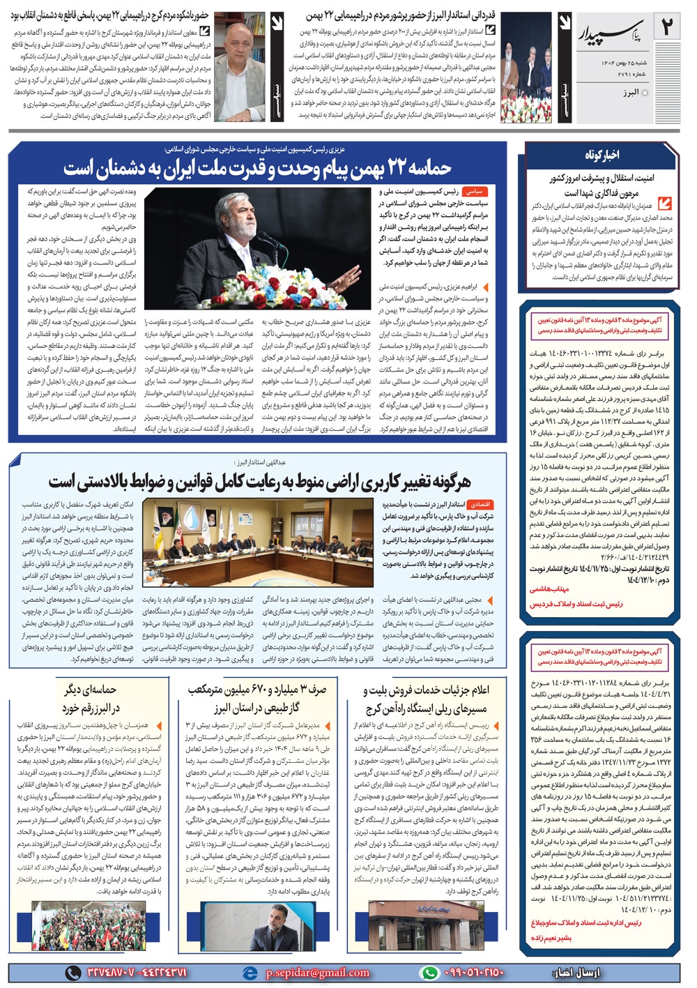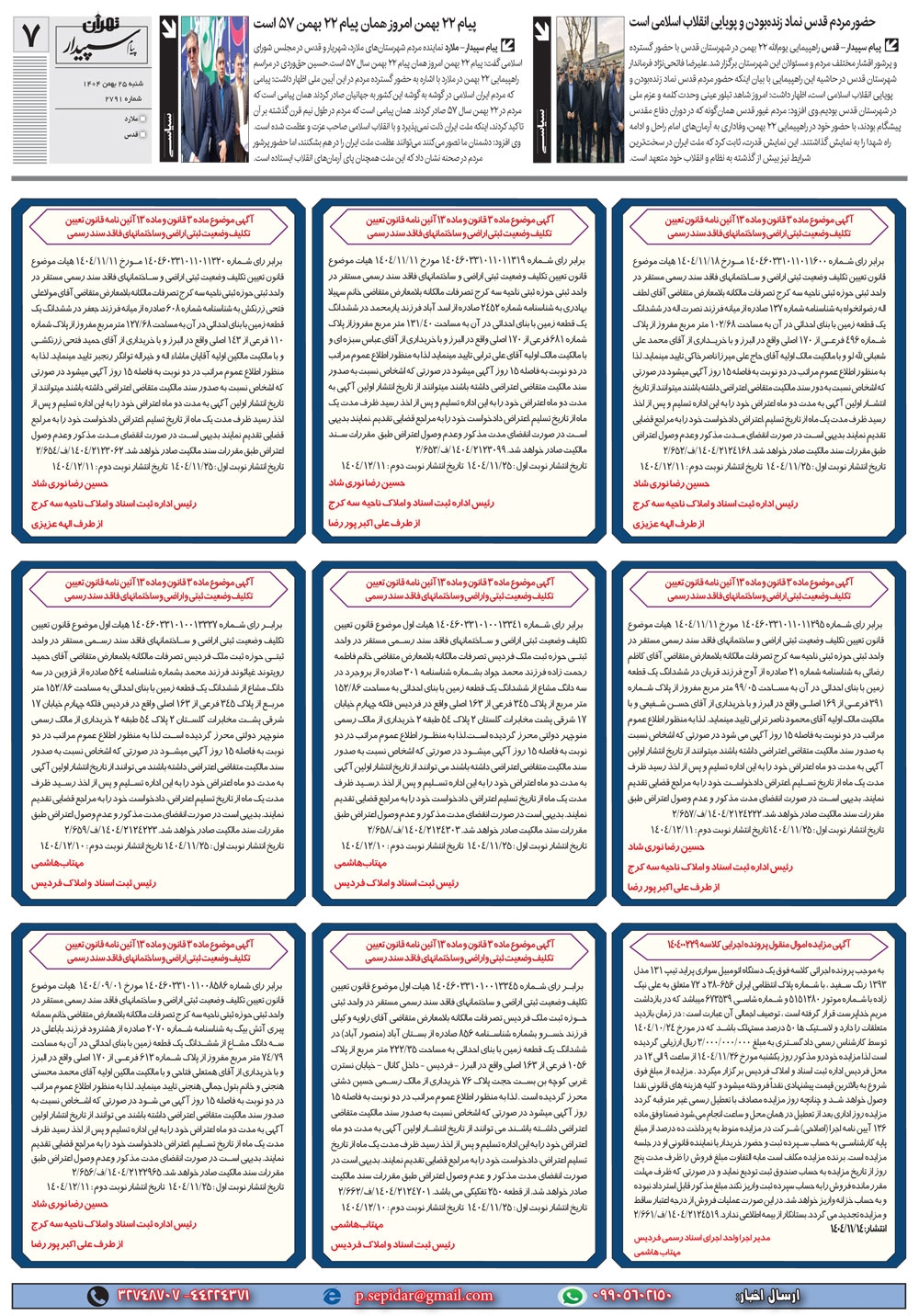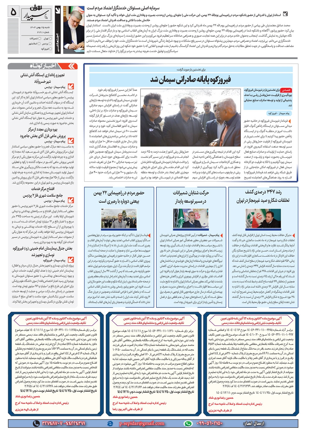 روزنامه پیام سپیدار شماره 2791 شنبه بیست و پنجم بهمن ماه سال هزارو چهارصدو چهار منتشر شد و در دسترس مخاطبین قرار گرفت. روزنامه پیام سپیدار را می توانید از کیوسک های مطبوعاتی سطح شهر تهیه کنید.