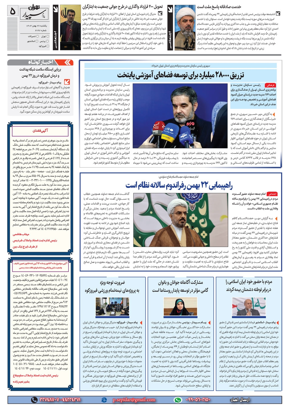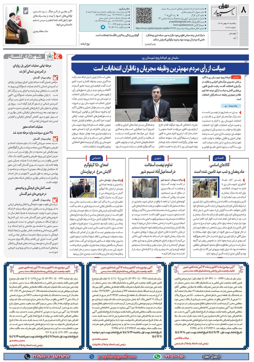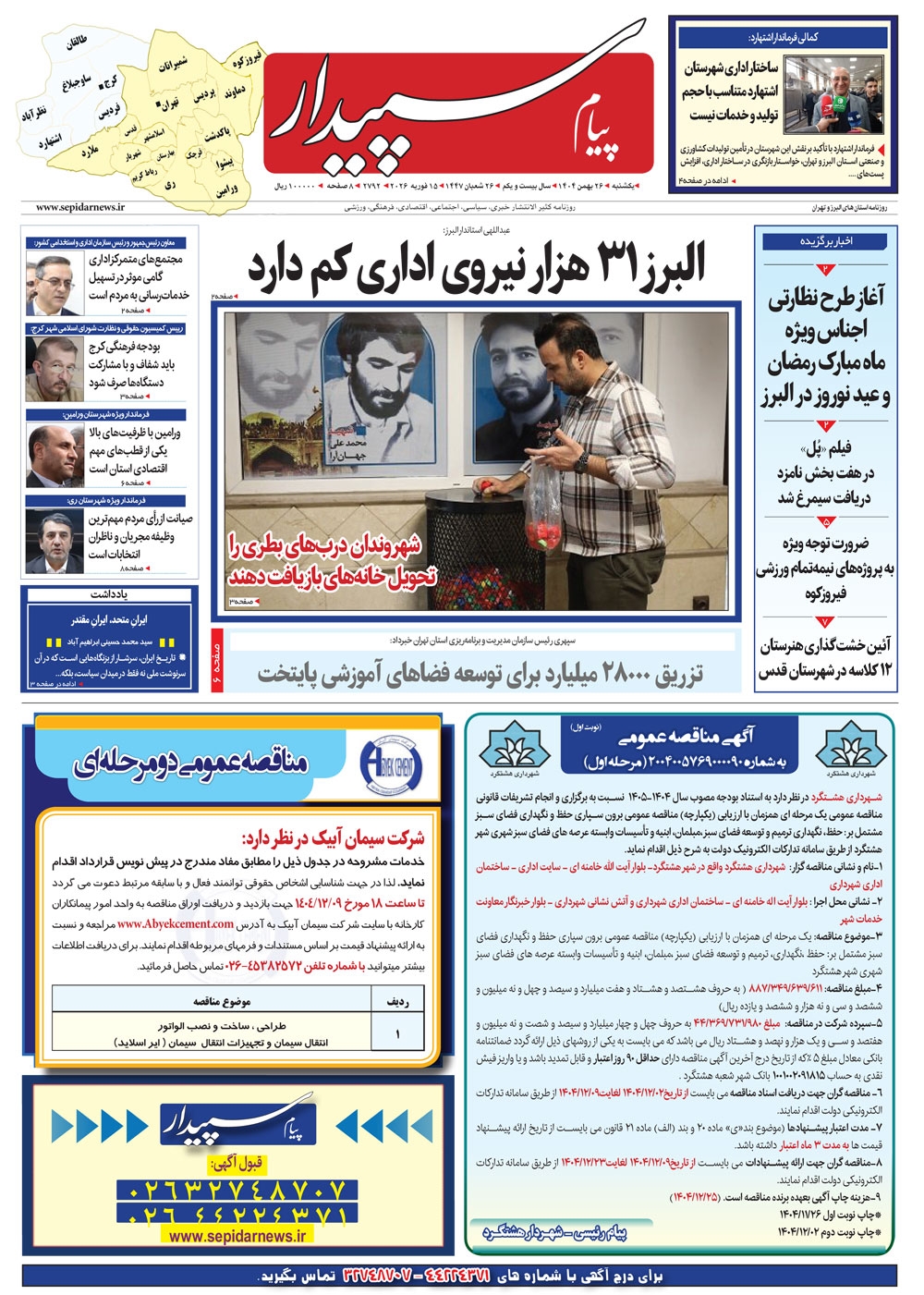 روزنامه پیام سپیدار شماره 2792 یکشنبه بیست و ششم بهمن ماه سال هزارو چهارصدو چهار منتشر شد و در دسترس مخاطبین قرار گرفت. روزنامه پیام سپیدار را می توانید از کیوسک های مطبوعاتی سطح شهر تهیه کنید.