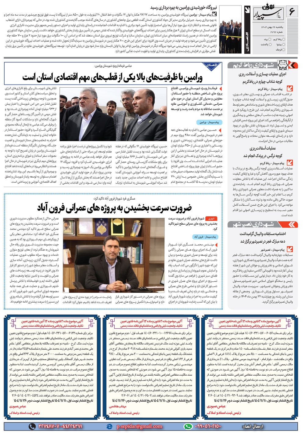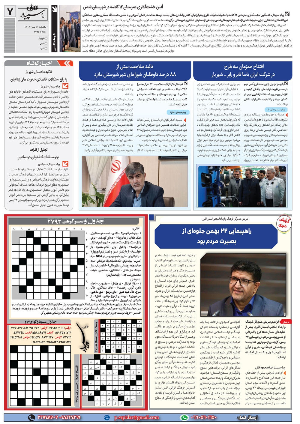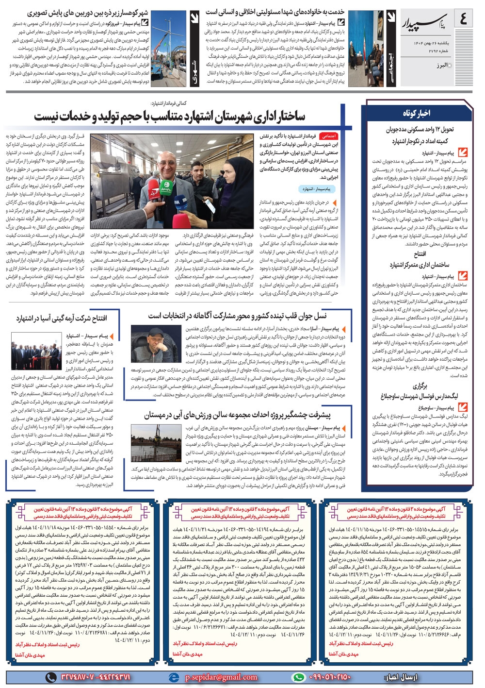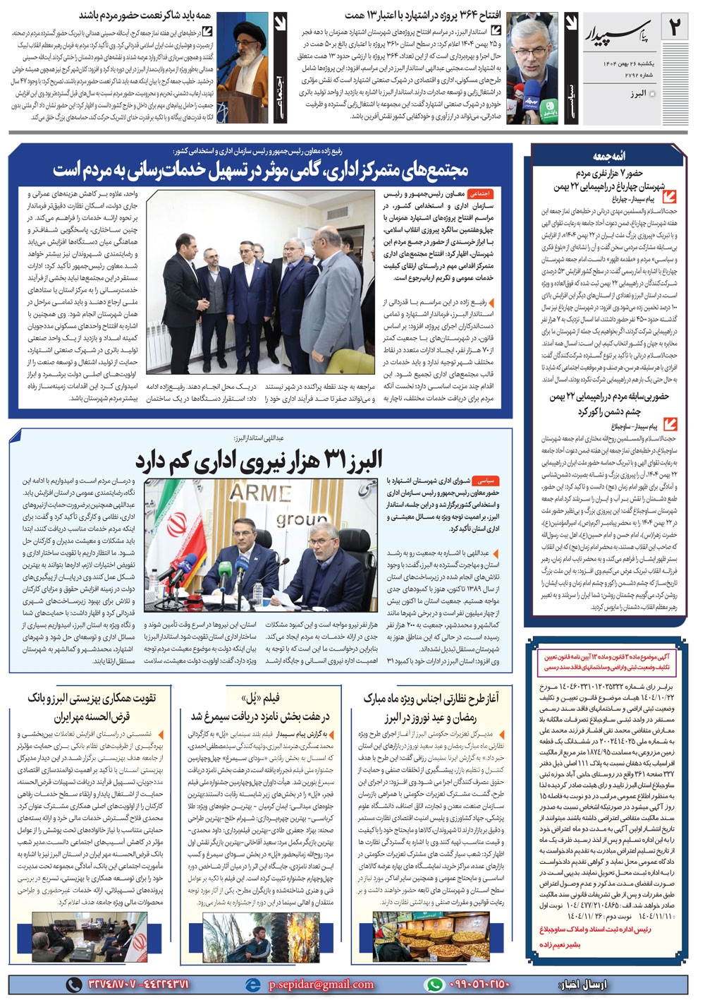 روزنامه پیام سپیدار شماره 2792 یکشنبه بیست و ششم بهمن ماه سال هزارو چهارصدو چهار منتشر شد و در دسترس مخاطبین قرار گرفت. روزنامه پیام سپیدار را می توانید از کیوسک های مطبوعاتی سطح شهر تهیه کنید.