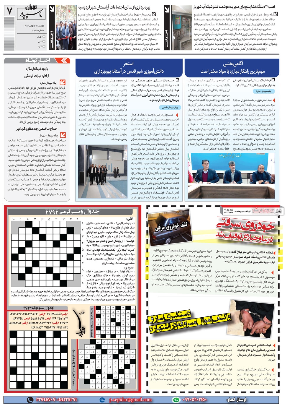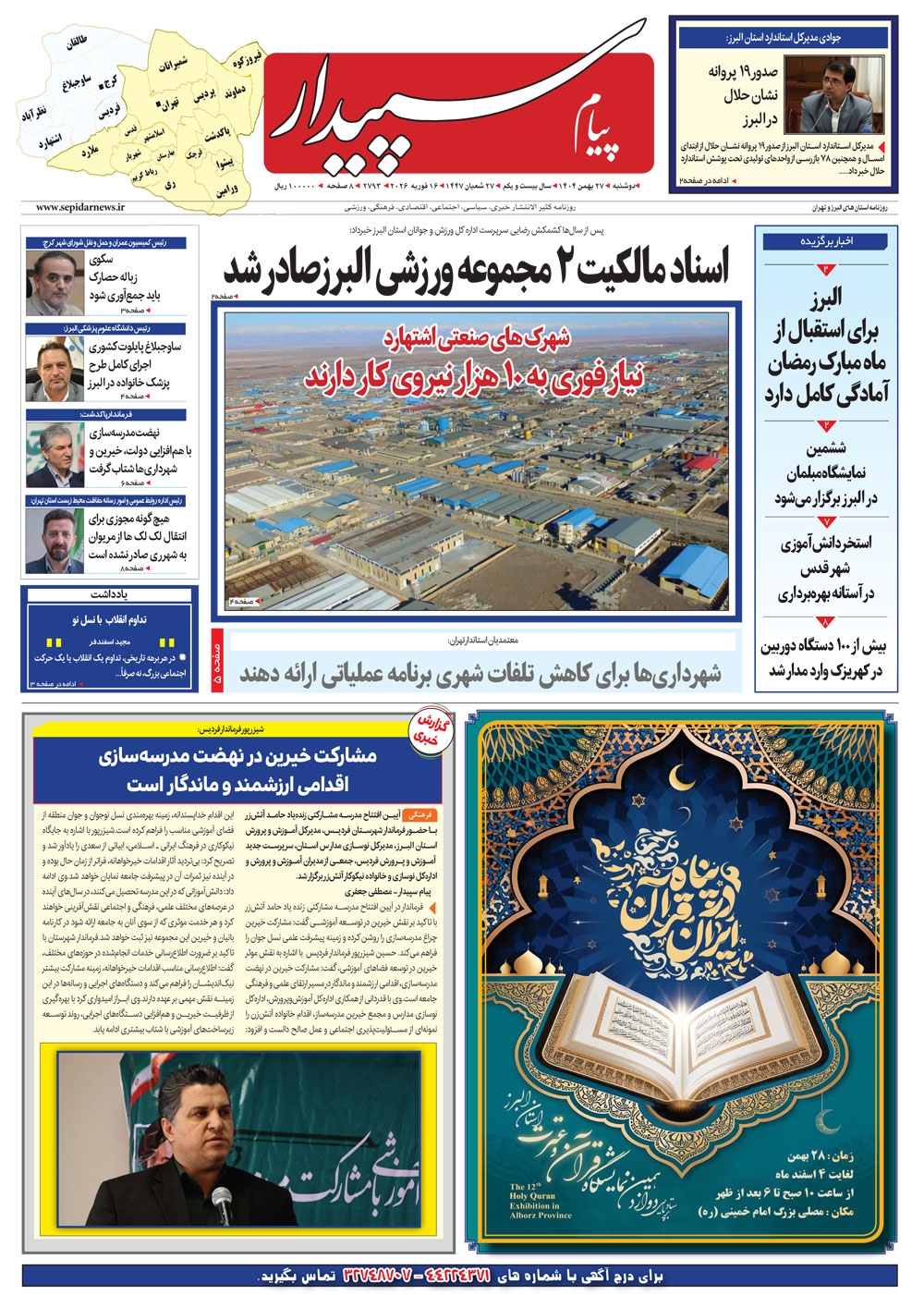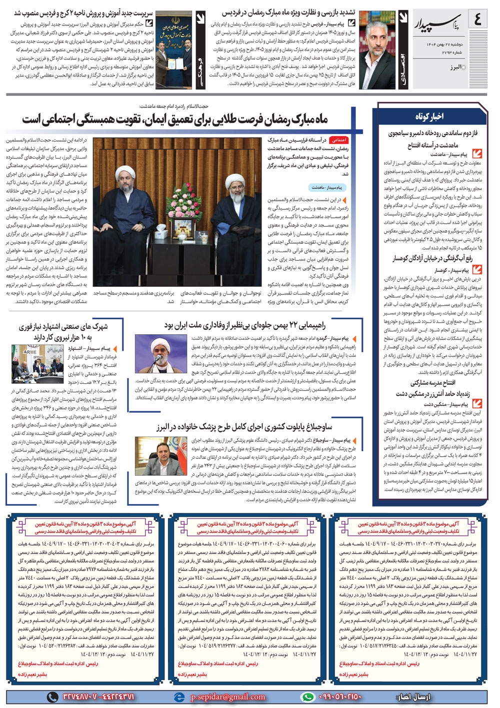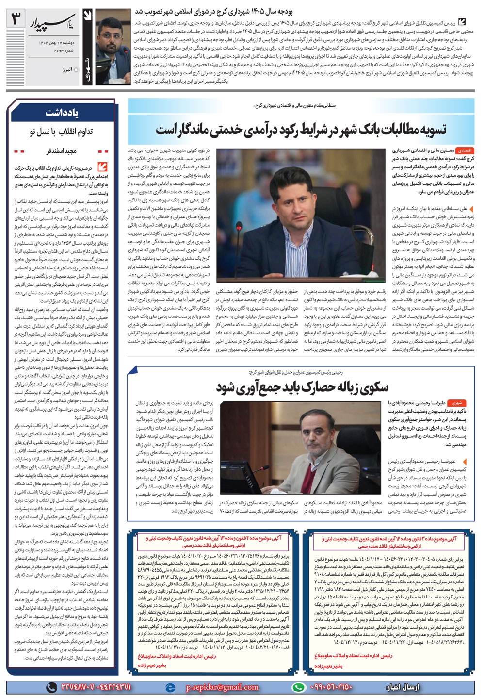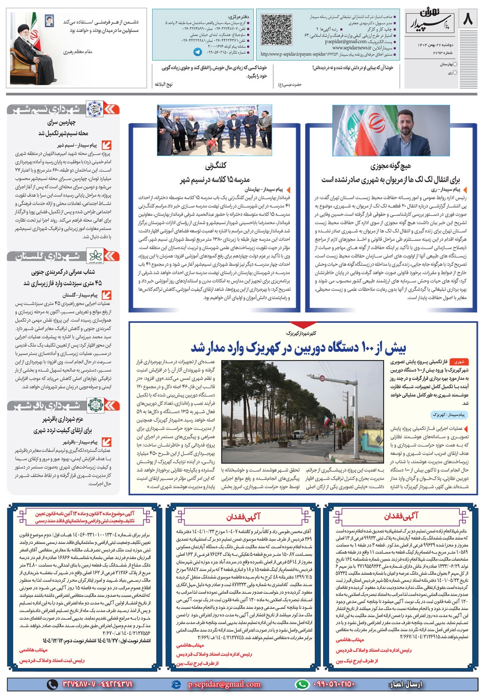 روزنامه پیام سپیدار شماره 2793 یکشنبه بیست و هفتم بهمن ماه سال هزارو چهارصدو چهار منتشر شد و در دسترس مخاطبین قرار گرفت. روزنامه پیام سپیدار را می توانید از کیوسک های مطبوعاتی سطح شهر تهیه کنید.