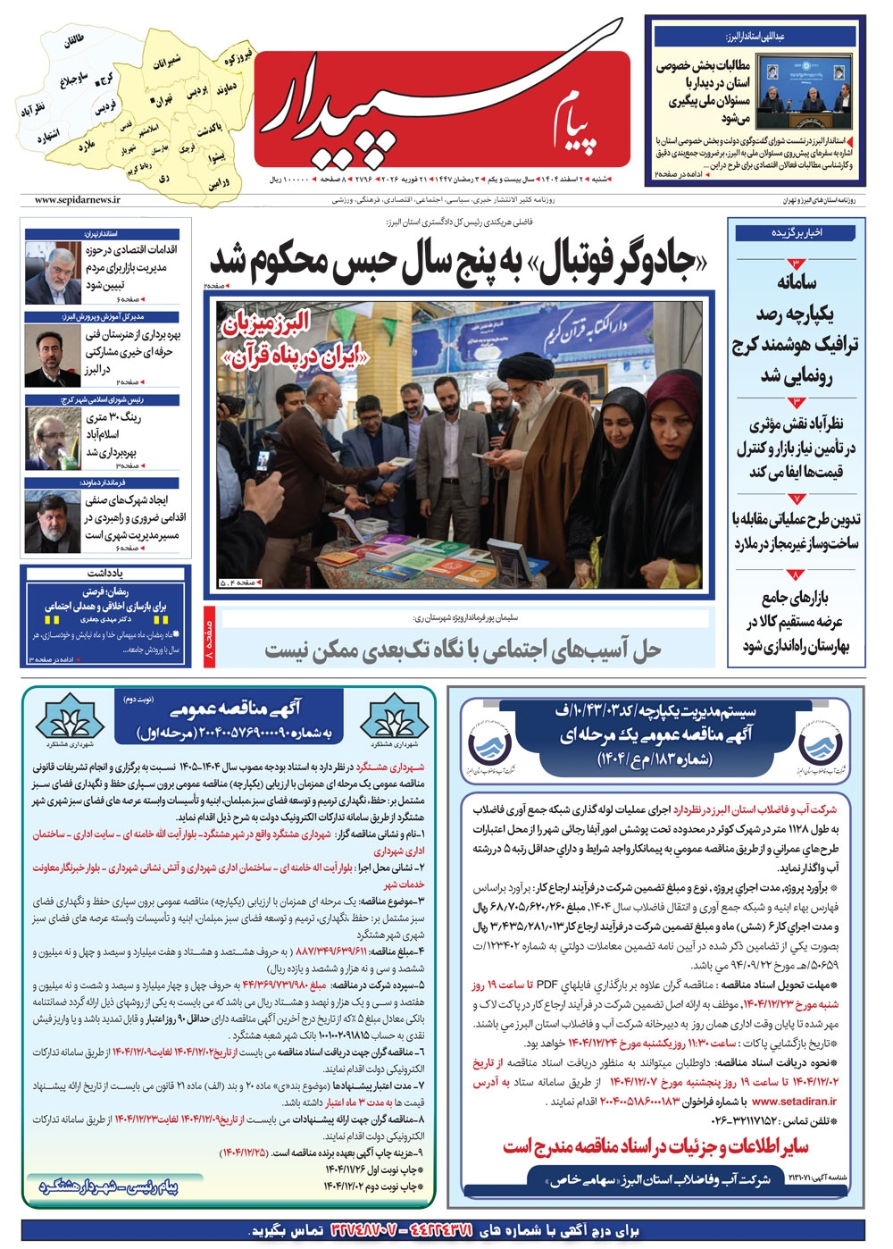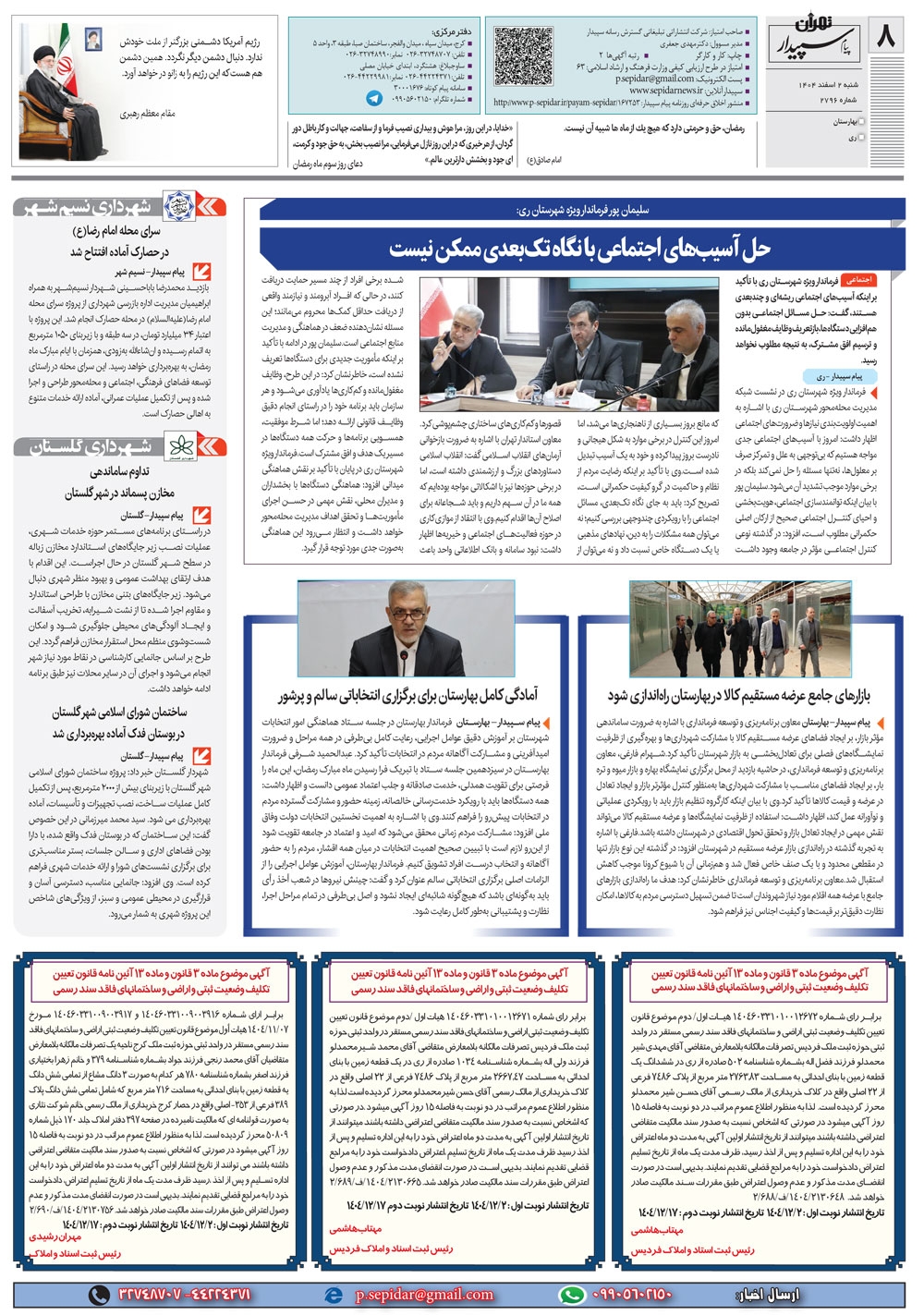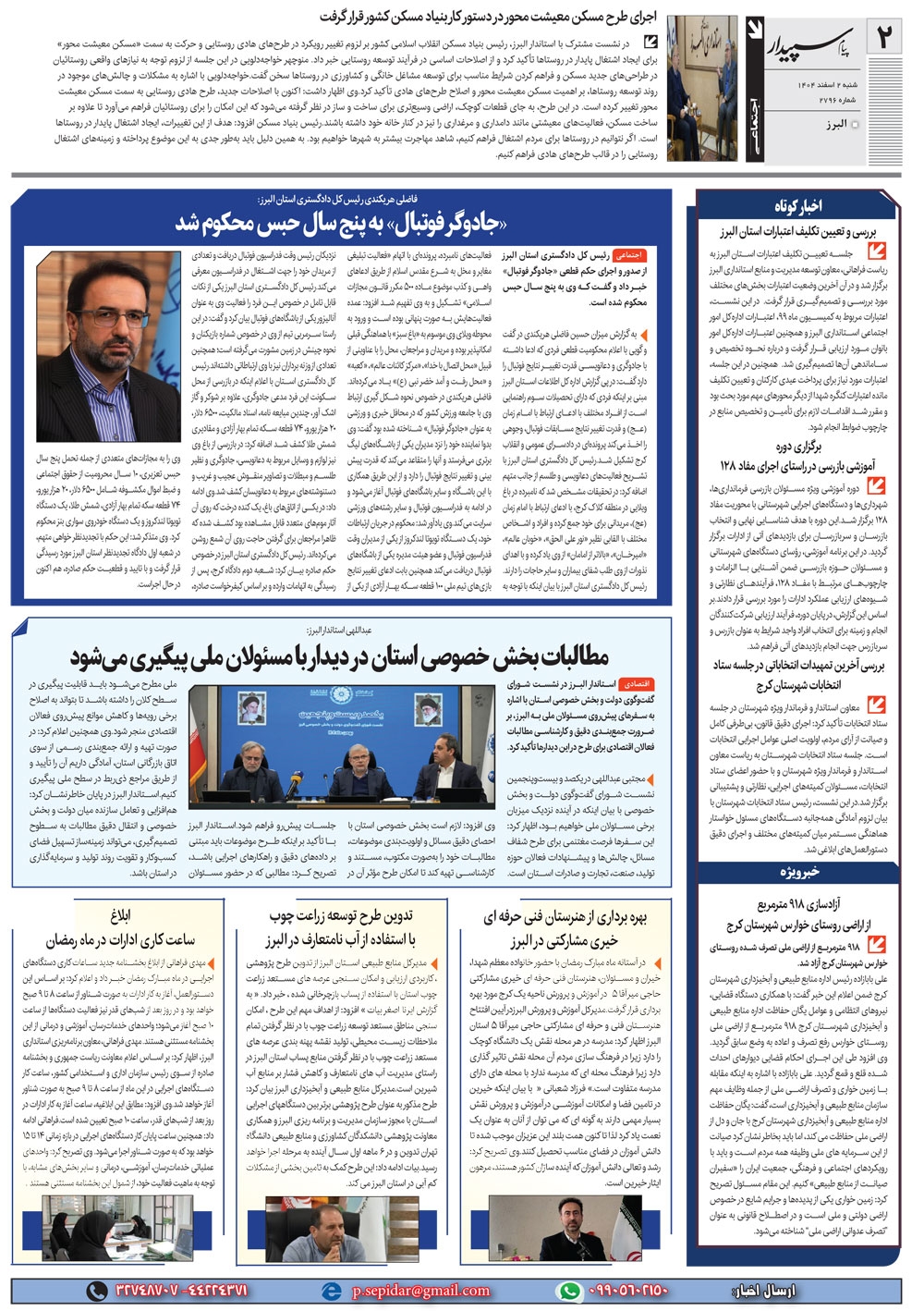 روزنامه پیام سپیدار شماره 2796 شنبه دوم اسفند ماه سال هزارو چهارصدو چهار منتشر شد و در دسترس مخاطبین قرار گرفت. روزنامه پیام سپیدار را می توانید از کیوسک های مطبوعاتی سطح شهر تهیه کنید.