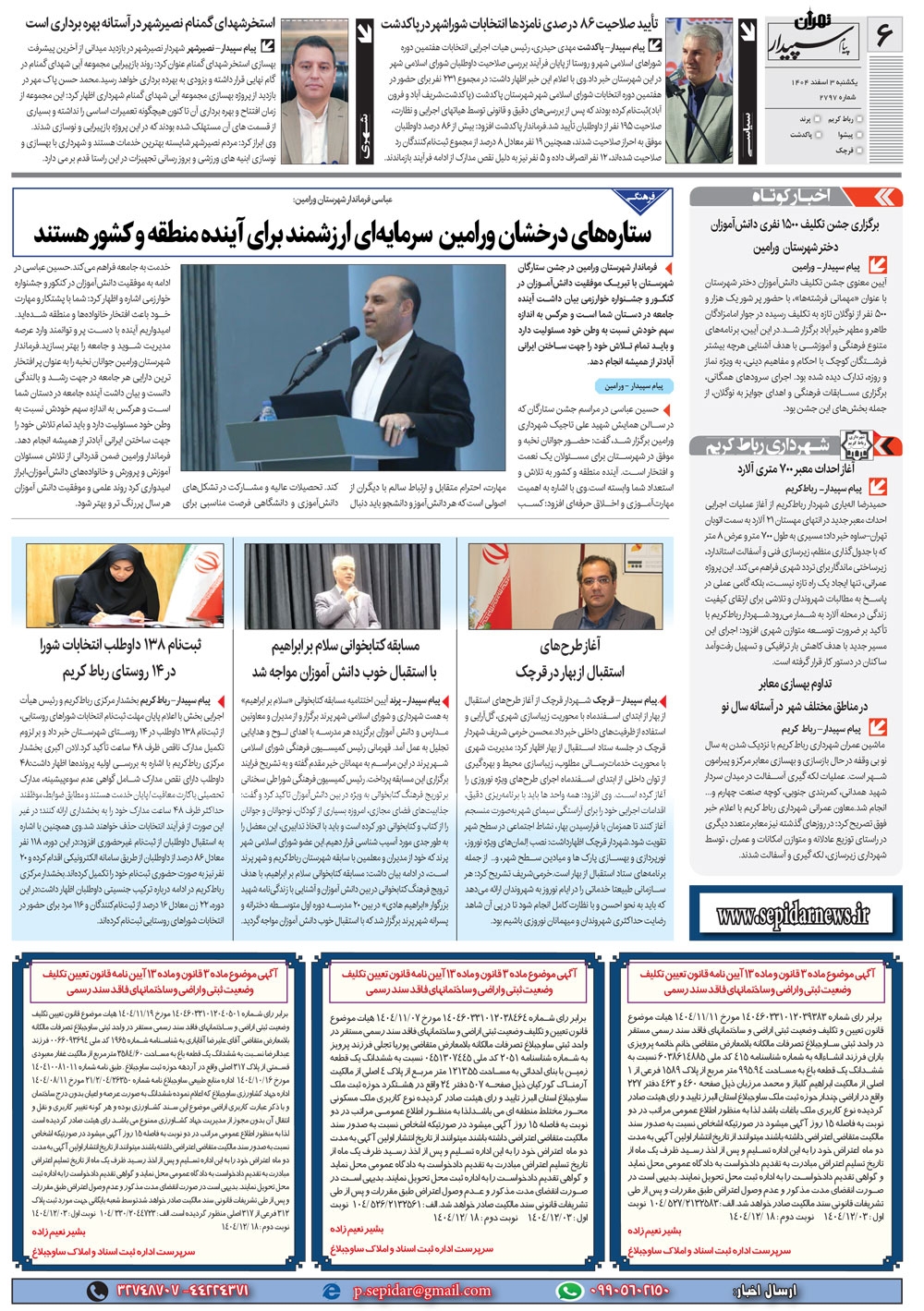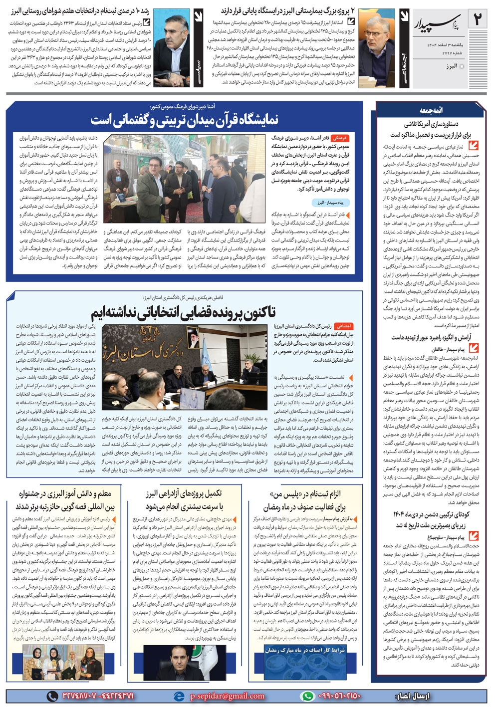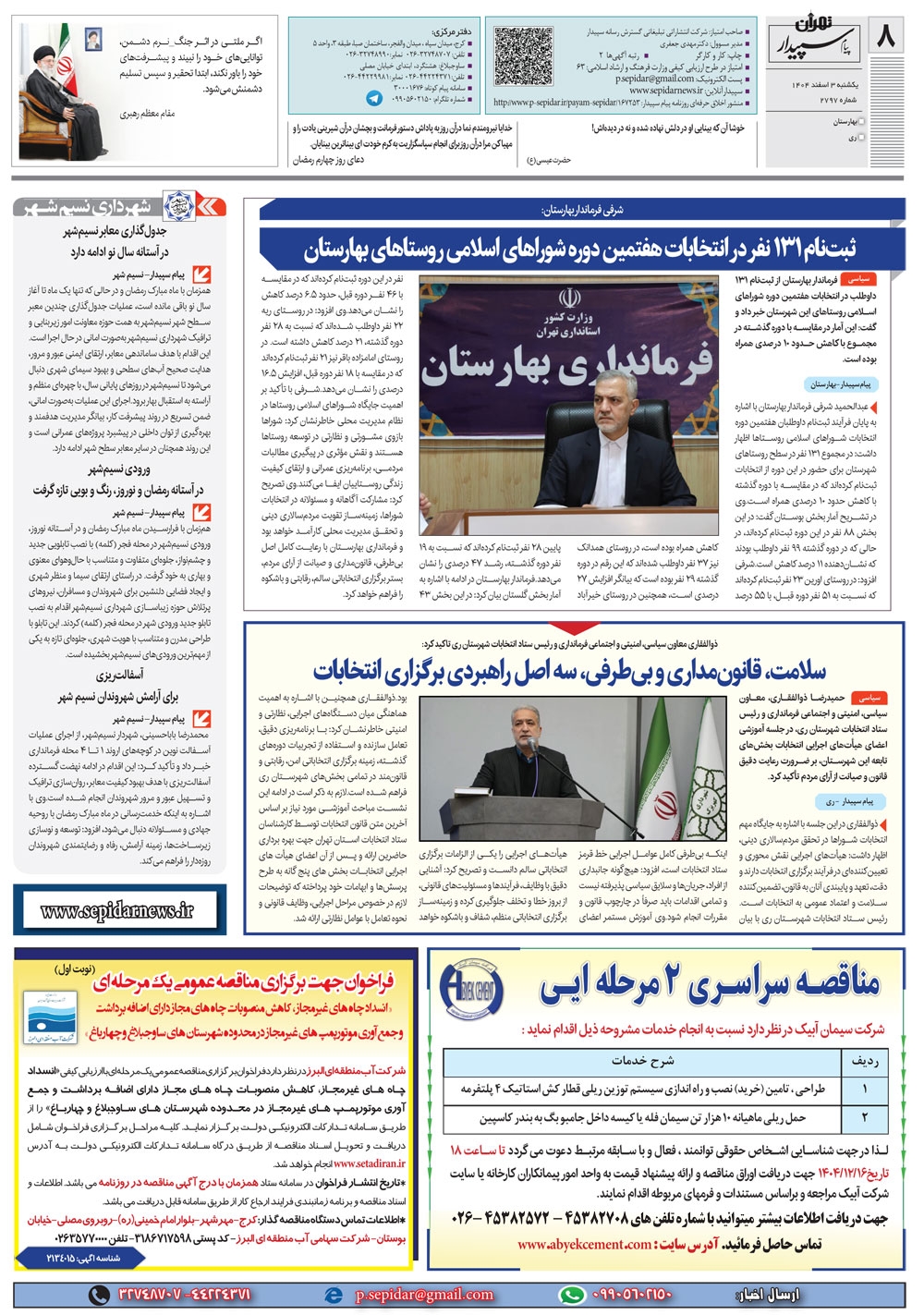 روزنامه پیام سپیدار شماره 2797 یکشنبه سوم اسفند ماه سال هزارو چهارصدو چهار منتشر شد و در دسترس مخاطبین قرار گرفت. روزنامه پیام سپیدار را می توانید از کیوسک های مطبوعاتی سطح شهر تهیه کنید.