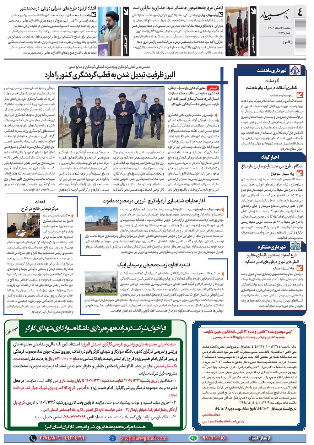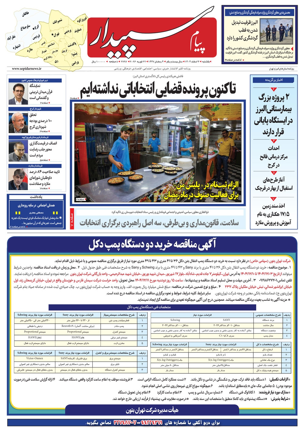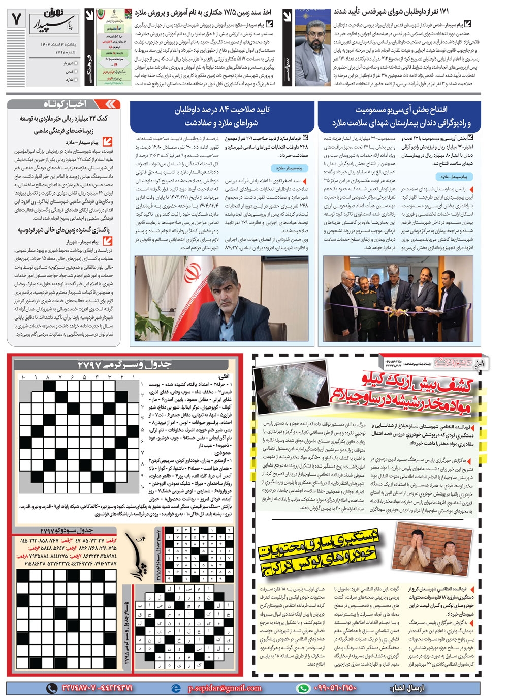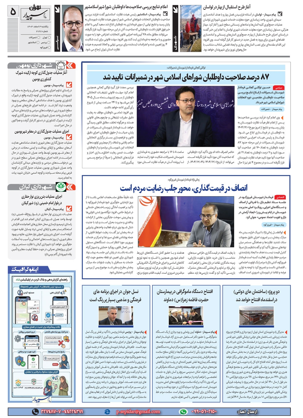 روزنامه پیام سپیدار شماره 2797 یکشنبه سوم اسفند ماه سال هزارو چهارصدو چهار منتشر شد و در دسترس مخاطبین قرار گرفت. روزنامه پیام سپیدار را می توانید از کیوسک های مطبوعاتی سطح شهر تهیه کنید.