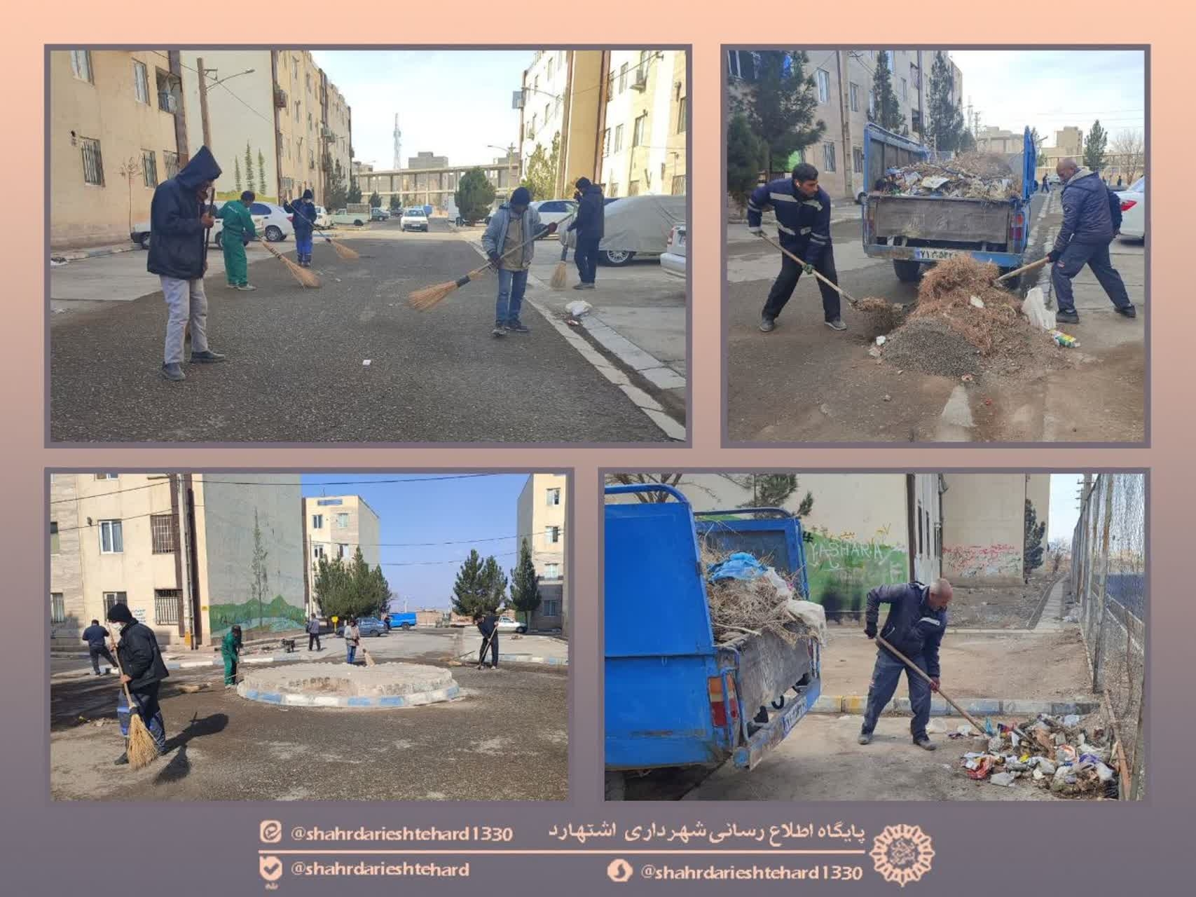 نیروهای خدمات شهر شهرداری اشتهارد با اجرای طرحی جهادی، محوطه مجتمع های مسکونی منظریه واقع در شهرک سلمان فارسی (مسکن مهر) را به طور کامل نظافت و پاکسازی کردند.