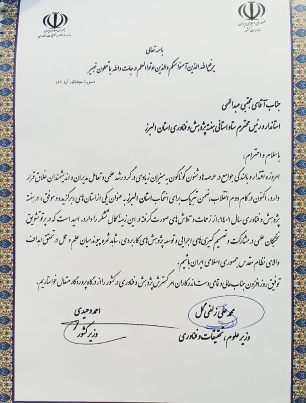 امروزه اقتدار و بالندگی جوامع در عرصه ها و شئون گوناگون به میزان زیادی در گرو رشد علمی و تعامل مدیران و اندیشمندان خلاق قرار دارد. اکنون در گام دوم انقلابف ضمن تبریک برای انتخاب استان البرز بعنوان یکی از استان های برگزیده و موفق در هفته پژوهش و فناوری سال 1401 از زحمات و تلاش های صورت گرفته در این زمینه کمال تشکر را دارد. امید است که در پرتو تشویق نخبگان علمی در مشارکت و تصمیم گیری های اجرایی و توسعه پژوهش های کاربردی، شاهد ثمره پیوند میان علم و عمل در تحقق اهداف والای نظام مقدس جمهوری اسلامی ایران باشیم.توفیق روز افزون جنابعالی و تمامی دست اندر کاران امر گسترش پژوهش و فناوری در کشور را از درگاه پروردگار متعال خواستاریم.