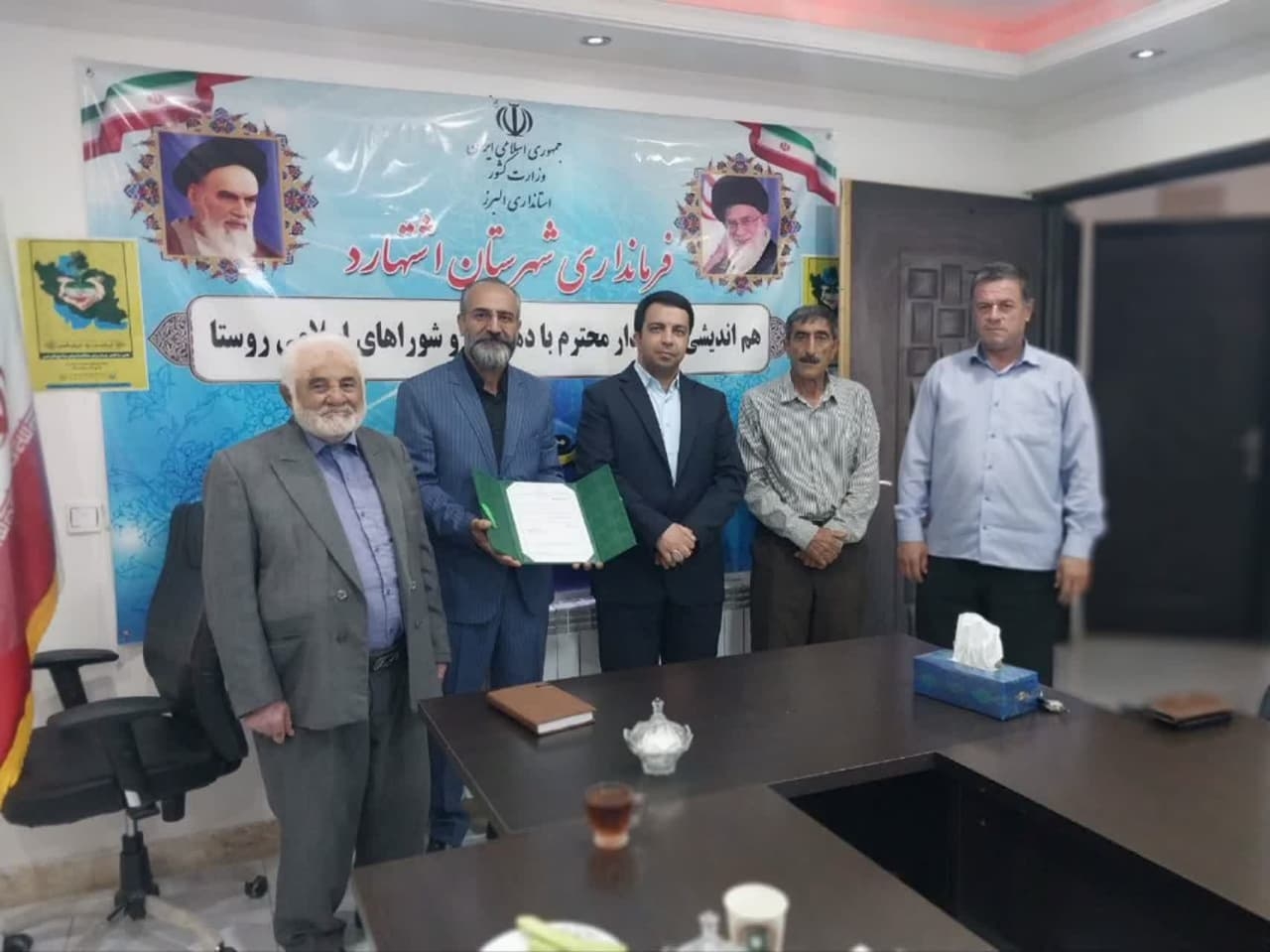 در این مراسم، ضمن تقدیر از خدمات و زحمات آقای مجید نجار، سرپرست پیشین دهیاری، حکم انتصاب آقای صالحی به عنوان سرپرست جدید دهیاری به وی اعطا شد.بخشدار مرکزی اشتهارد در ادامه، بر لزوم تعامل سازنده، هم‌افزایی و تلاش مستمر در جهت ارتقاء شاخص‌های عمرانی، خدماتی و اجتماعی در روستا تأکید کرد.آزاد فلاح ضمن آرزوی توفیق برای آقای صالحی، از خدمات ارزنده آقای نجار نیز قدردانی کرد.