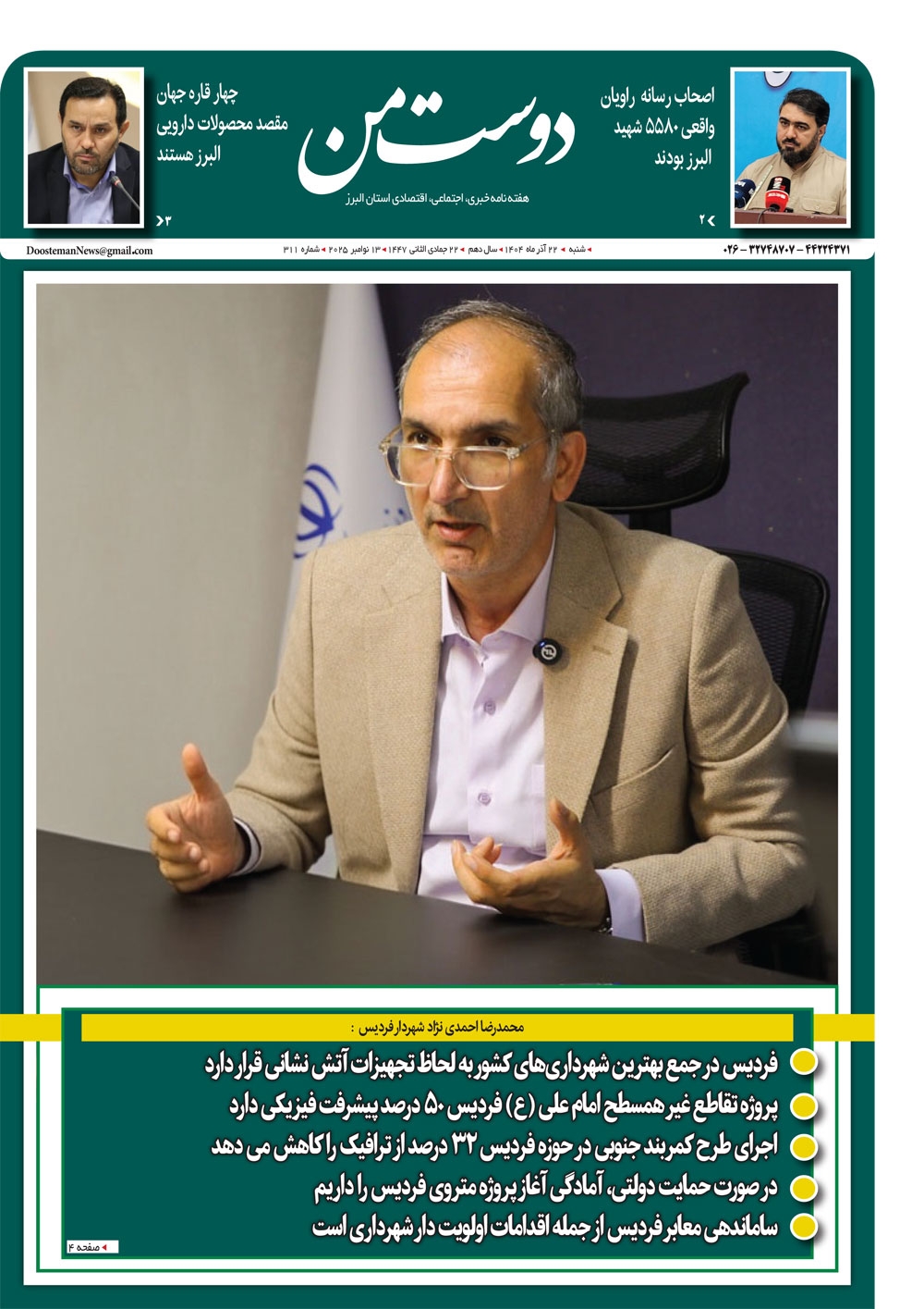 هفته نامه دوست من شماره 311 شنبه بیست و دوم آذر ماه سال هزار و چهارصدو سه منتشر شد و در دسترس مخاطبین قرار گرفت. هفته نامه دوست من را می توانید از کیوسک های مطبوعاتی سطح شهر تهیه کنید.