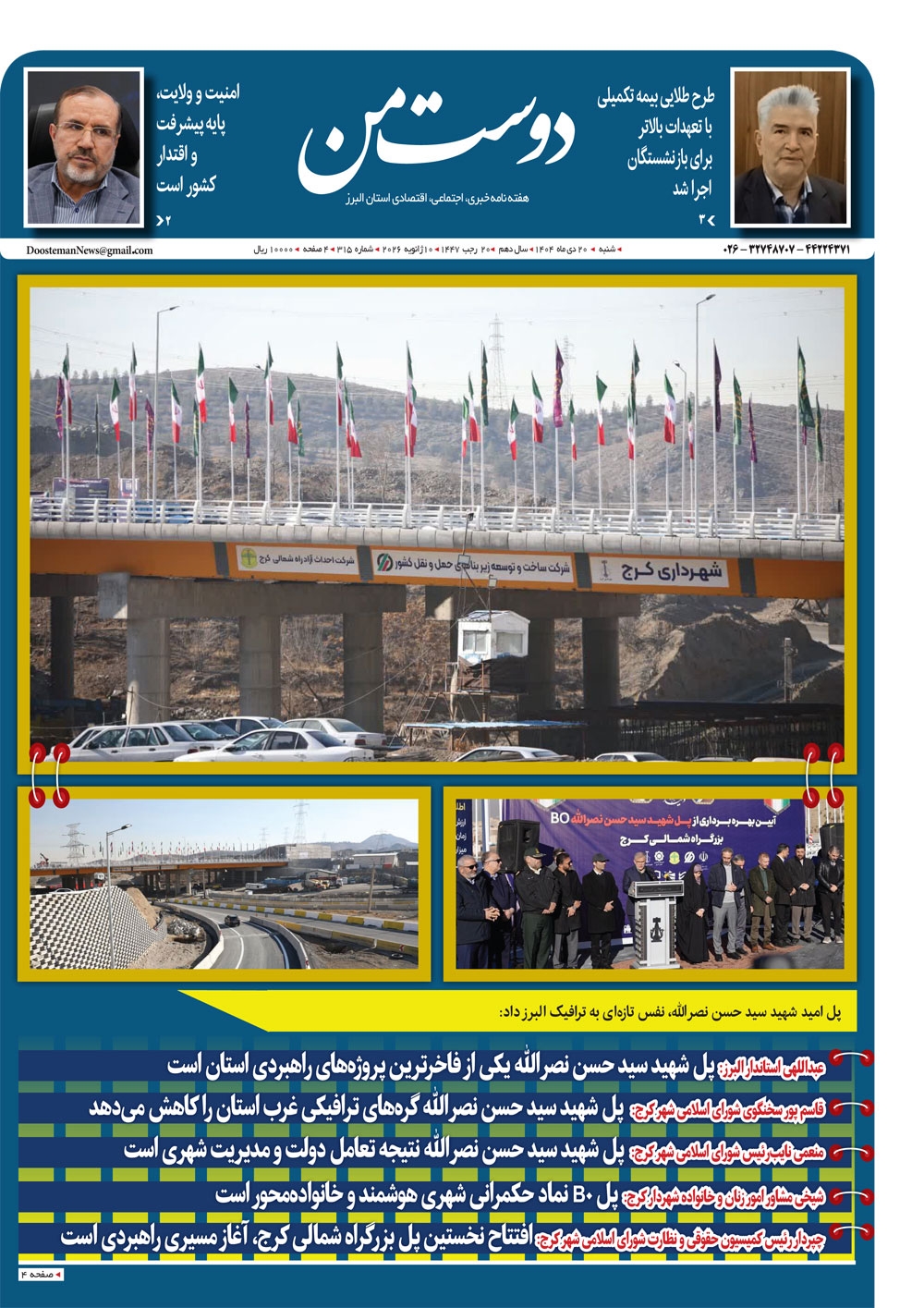 هفته نامه دوست من شماره 315 شنبه بیستم دیماه سال هزار و چهارصدو سه منتشر شد و در دسترس مخاطبین قرار گرفت. هفته نامه دوست من را می توانید از کیوسک های مطبوعاتی سطح شهر تهیه کنید.