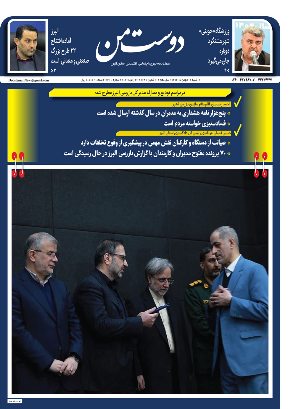هفته نامه دوست من شماره 316 شنبه چهارم بهمن ماه سال هزار و چهارصدو سه منتشر شد و در دسترس مخاطبین قرار گرفت. هفته نامه دوست من را می توانید از کیوسک های مطبوعاتی سطح شهر تهیه کنید.