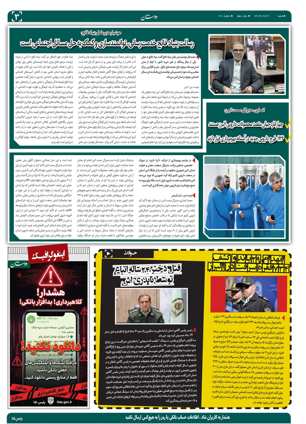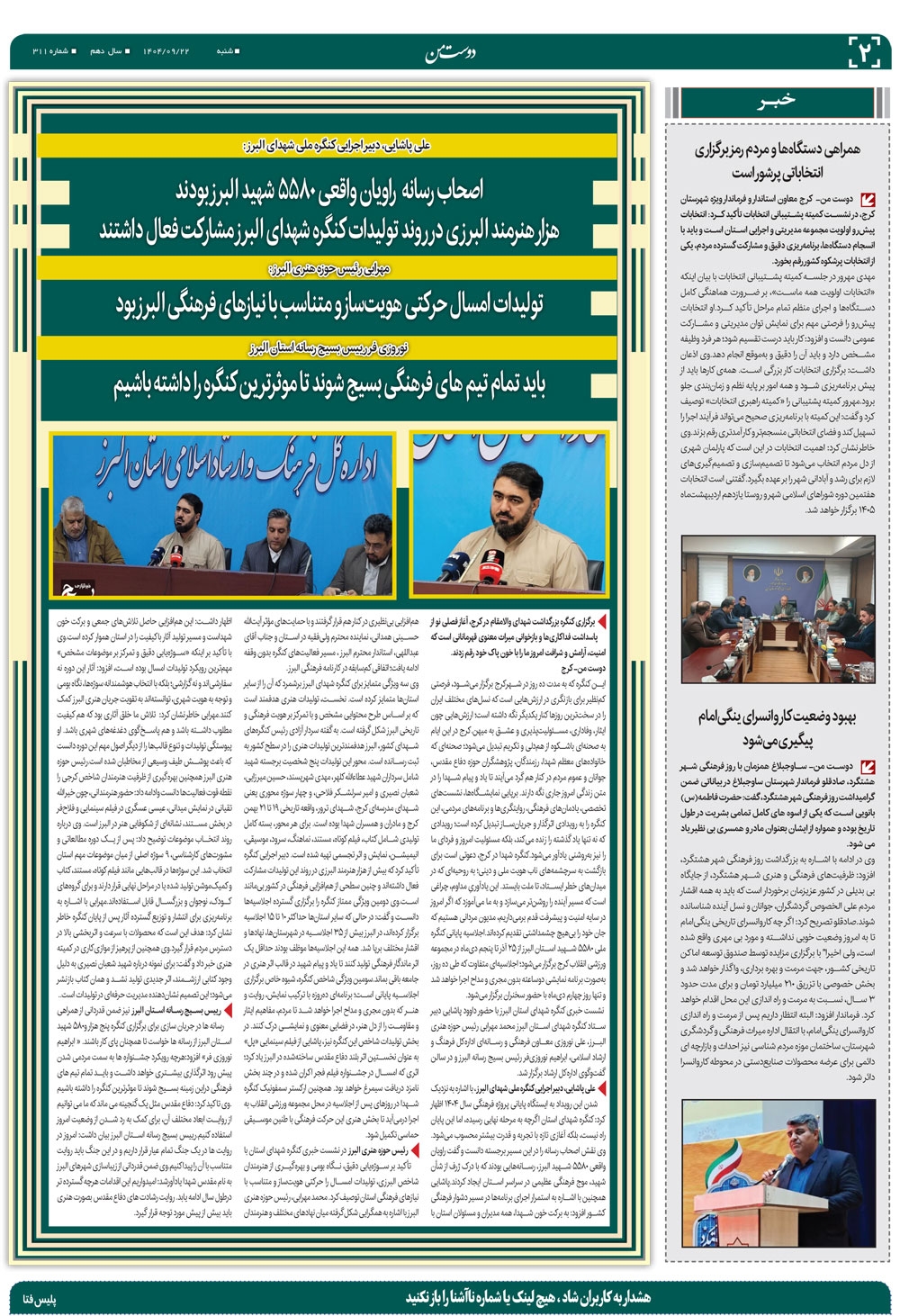 هفته نامه دوست من شماره 311 شنبه بیست و دوم آذر ماه سال هزار و چهارصدو سه منتشر شد و در دسترس مخاطبین قرار گرفت. هفته نامه دوست من را می توانید از کیوسک های مطبوعاتی سطح شهر تهیه کنید.